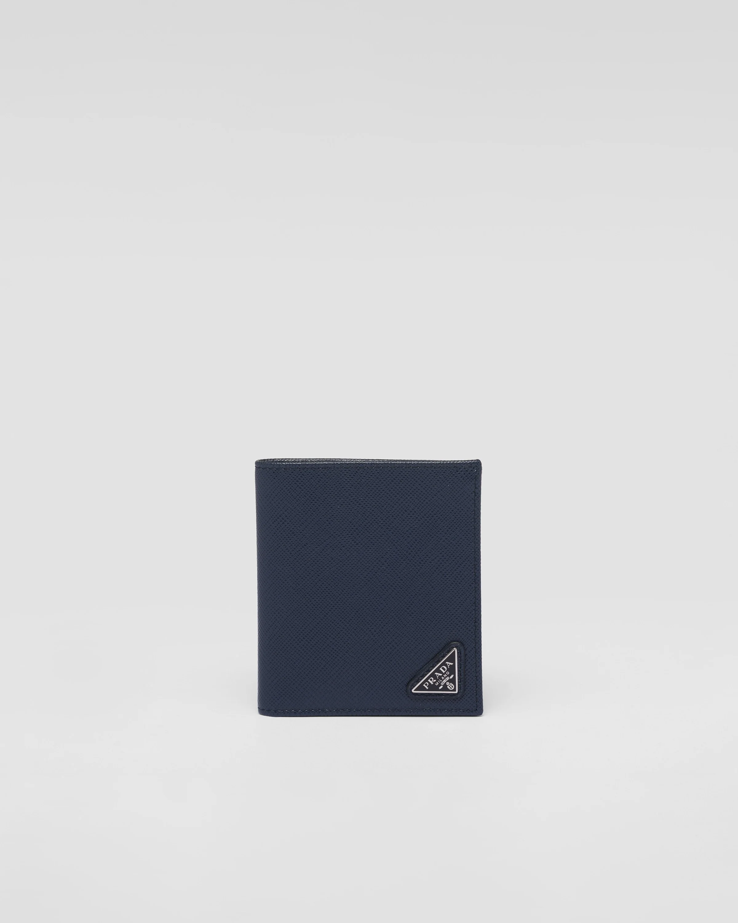 This elegant Saffiano leather wallet is decorated with the enamel triangle logo. It has two pockets, one bill compartment and eight card slots inside. - Product code: 2MO004_QHH_F0216 - Enameled metal triangle logo - Eight card slots - One bill compartment - Moire and Saffiano leather lining - Imported Height: 10cm Width: 9cm MATERIALS Main material: Calfskin
