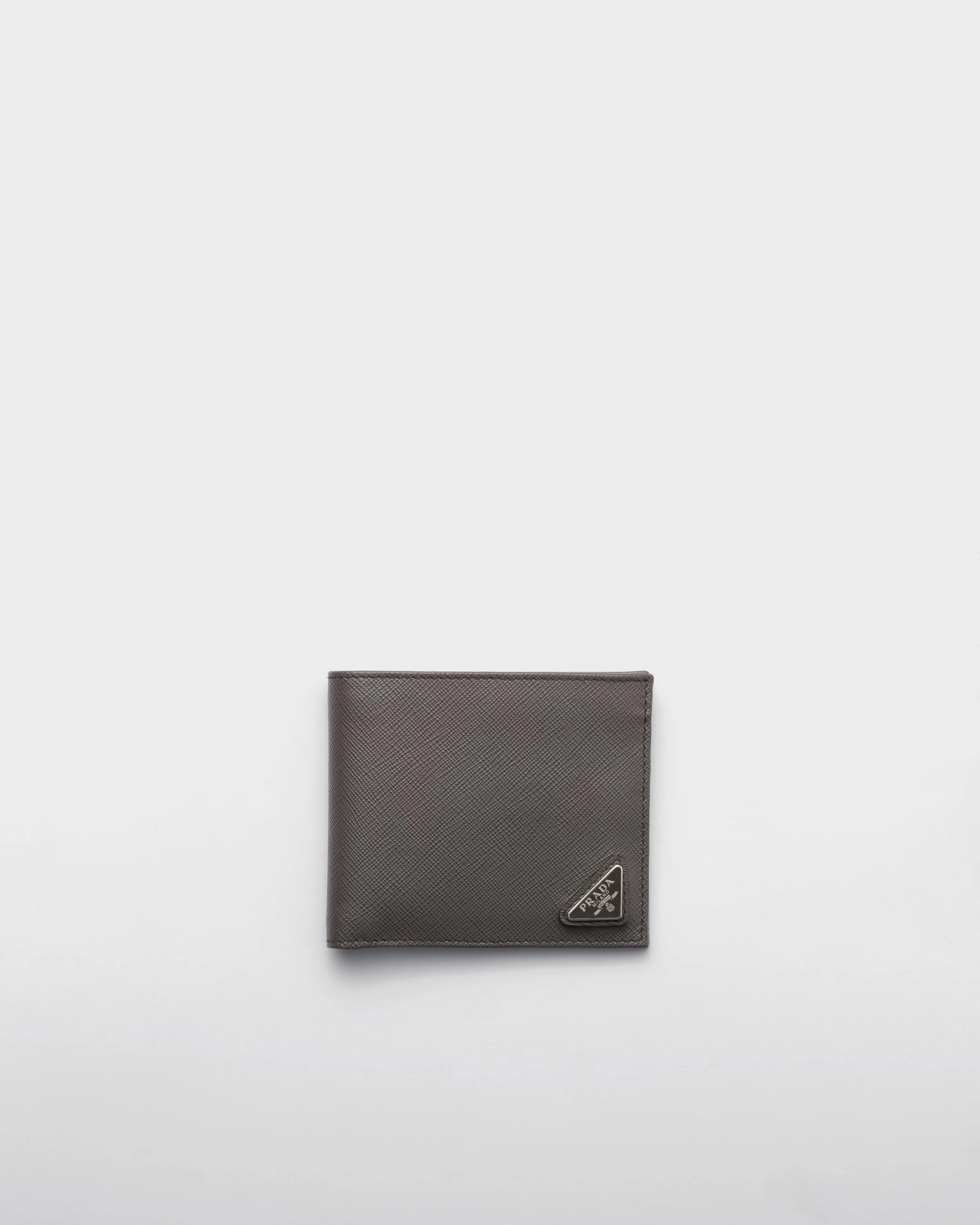 This leather wallet pairs Saffiano leather with an enameled triangle corner logo. Its interior is fabric-lined, and it opens to eight credit card slots and several pockets and compartments. - Product code: 2MO513_QHH_F0170 - Enameled metal triangle logo - Eight card slots - Two bill compartments - Moire and Saffiano leather lining - Imported Height: 9.5cm Width: 11cm MATERIALS Main material: Calfskin