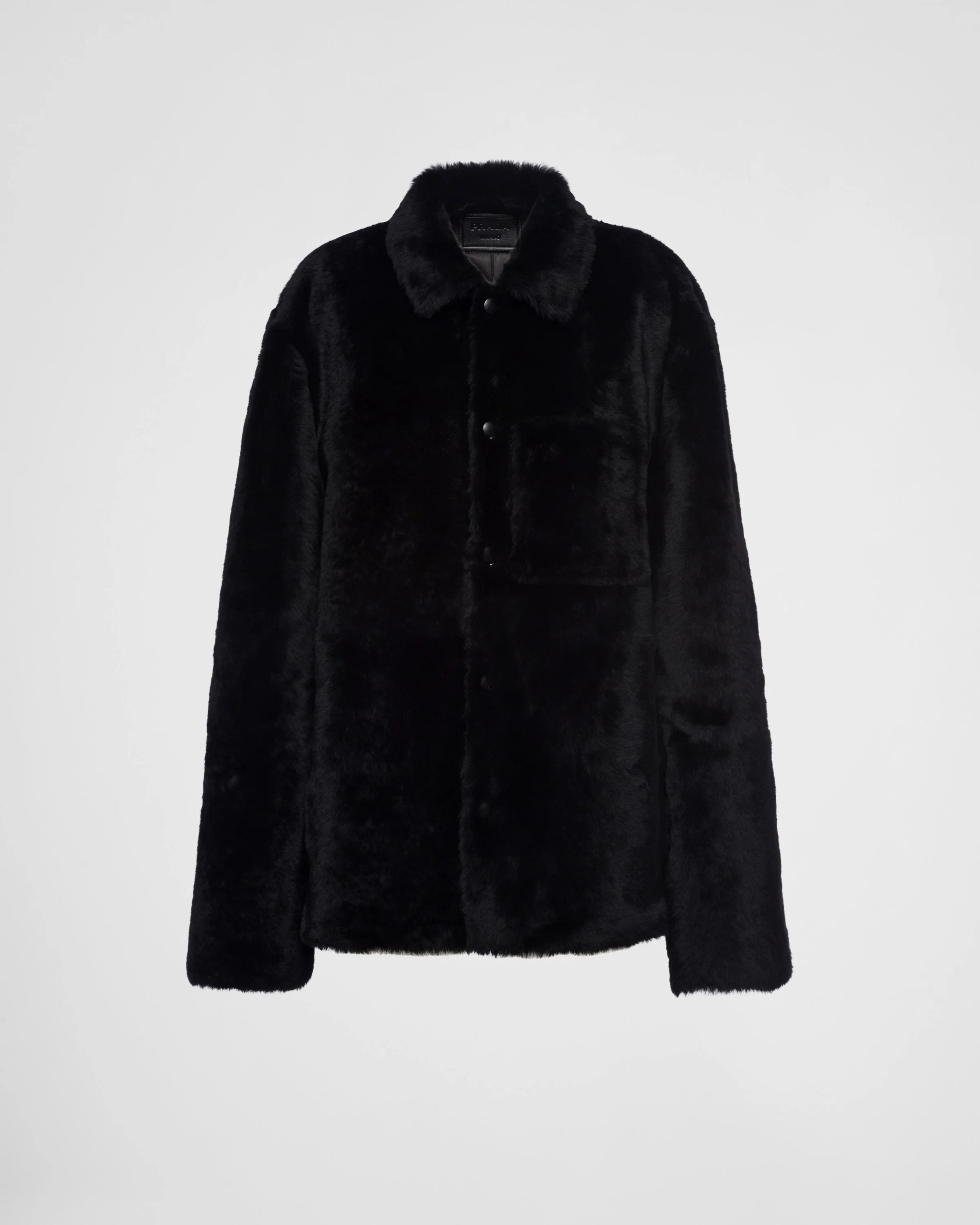 The sleek, classic silhouette of the blouson jacket is reinterpreted with a refined, contemporary cut. The shearling garment with soft lines and an oversized fit is defined by an elegant shirt-style collar and a patch pocket on the front. The leather triangle logo, reinterpreted with a conceptual design, completes the refined and modern garment with its distinctive signature touch. - Product code: UPW485_13C5_F0002_S_OOO - Unlined - Oversized fit - Center button closure - Shirt-style collar - Straight sleeves - Vertical pockets - Leather triangle logo on the back - Imported - The model is 178 cm tall and wears a size 38 Height: 72cm MATERIALS Main material: Lambskin