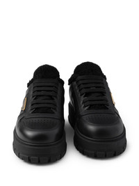 shearling leather sneakers Highlights - Black - Leather - Shearling lining - Front lace-up fastening - Branded heel counter - Gold-tone logo lettering - Enamel triangle logo - Round toe - Perforated toebox - Flatform sole - Rubber tread sole Composition Outer: Leather 100% Sole: Rubber 100% Lining: Sheep Skin/Shearling 100%
