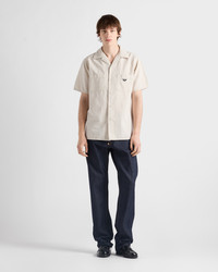 A soft touch and fine texture make this short-sleeved chambray shirt a structured garment perfect for summer. The boxy silhouette expresses contemporary charm, while the metal triangle logo adds an iconic note. - Product code: GEC094_14J2_F0ABR_S_AEO - Rinse Treatment - Boxy fit - Bowling collar - Short sleeves - Front button closure - Patch pocket on the chest - Straight hem - Center-back length: 76cm, Size: M - Triangle logo - Imported - The model is 188 cm tall and wears a size 48 Height: 76cm MATERIALS Main material: 65% cotton 35% linen