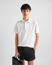 This cotton polo shirt with minimalist lines and boxy silhouettes expresses casual but refined style. The design with sleek lines is embellished with mother-of-pearl buttons and is decorated with the tonal fabric triangle logo. - Product code: UJN851_13CC_F0009_S_232 - Boxy fit - Short sleeves - Straight hem - Mother-of-pearl buttons - Fabric triangle logo - Imported - The model is 187 cm tall and wears a size 48 Height: 70cm MATERIALS Main material: 100% cotton