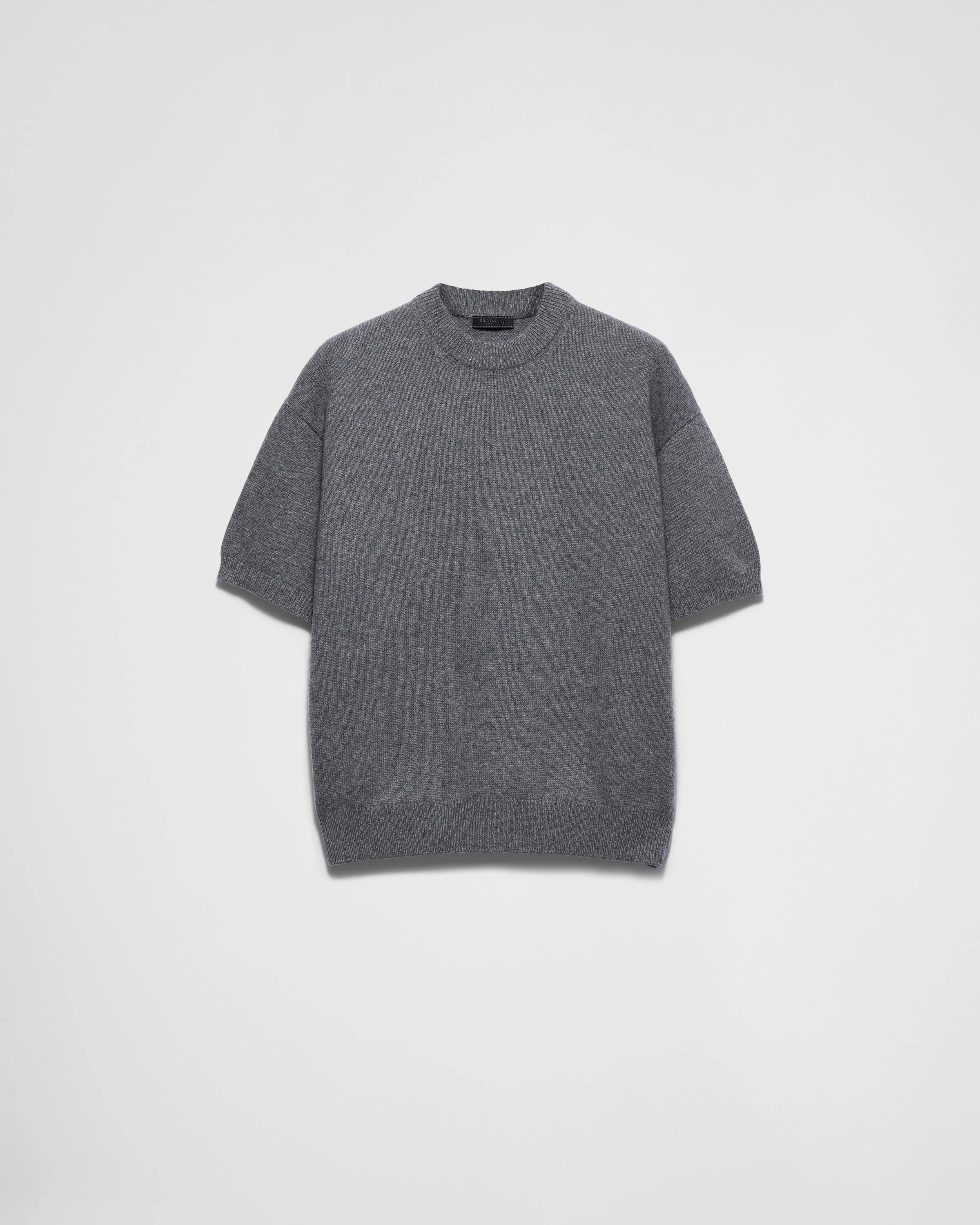 Classic lines and sleek details define this short-sleeved sweater made of soft regenerated cashmere with ribbed knit trim. The tonal triangle logo completes the refined and versatile style. - Product code: UMB675_16ZJ_F063H_S_OOO - Plain knit - Oversized fit - Ribbed knit crew neck - Semi-raglan shoulder - Ribbed knit hem - Knit triangle logo - This garment is made with regenerated cashmere yarn - Imported - The model is 189 cm tall and wears a size 38 Height: 66cm MATERIALS Main material: 100% recycled cashmere