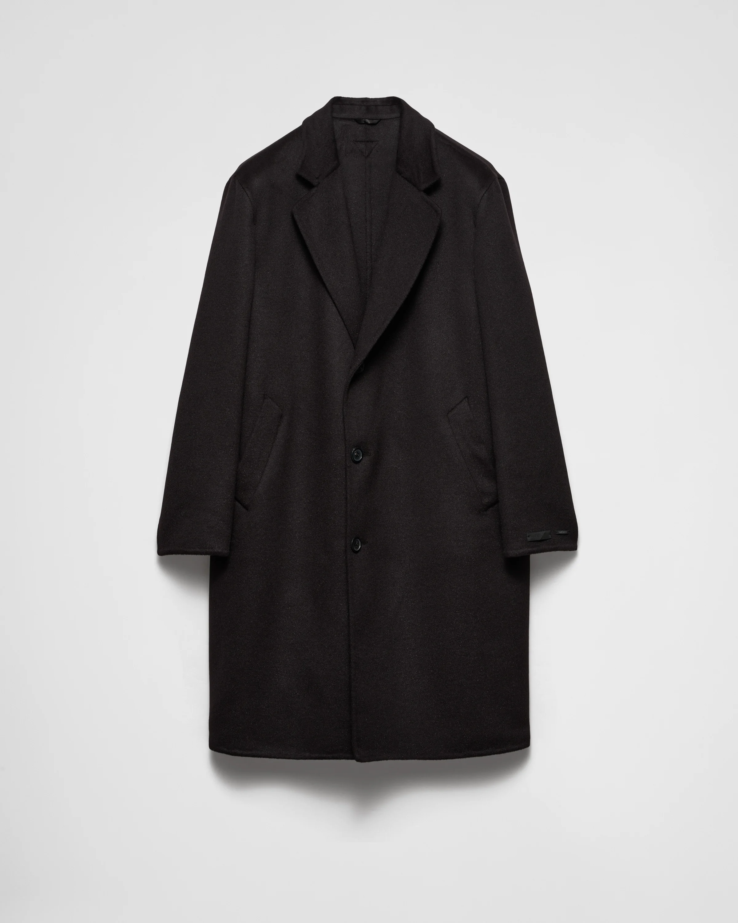 This wool blend coat with classic elegance expresses sartorial rigor and precision. The single-breasted silhouette is completed by the sleek and iconic geometric shape of the triangle logo. - Product code: UC520D_03H_F0002_S_OOO - Straight fit - Double-weave fabric - Classic lapels - Center vent - Three button closure - Cuffs without buttons - Wide welt pockets - Unlined - Fabric triangle logo on the back - Garment made of double-weave fabric with hand-stitched details. - Imported - The model is 190 cm tall and wears a size 48 Height: 108cm MATERIALS Main material: 40% angora 5% cashgora 55% virgin wool