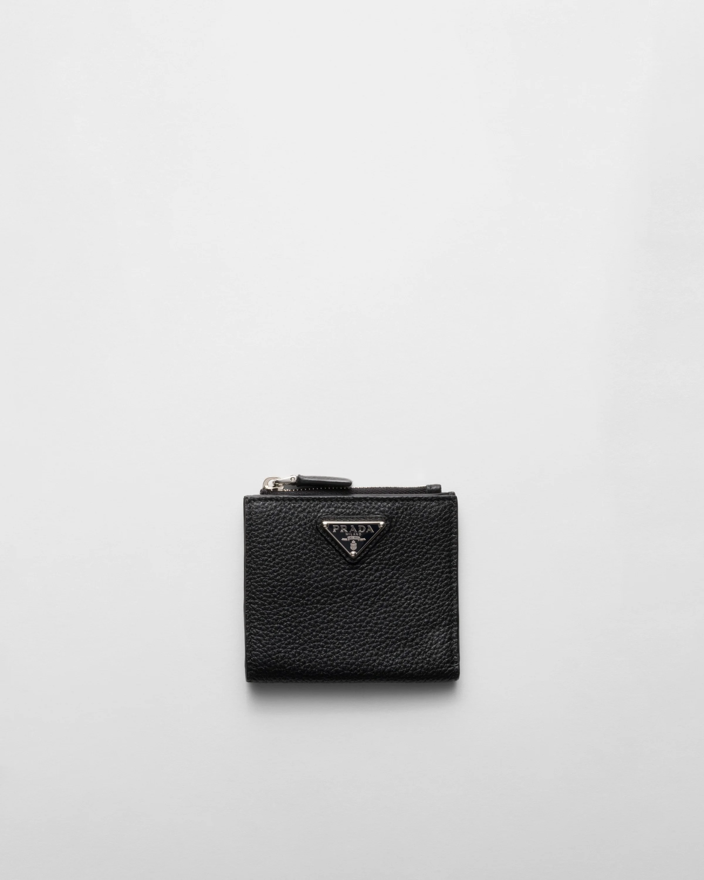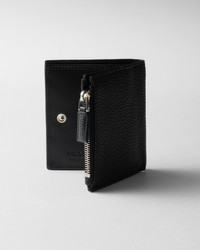 Sleek lines and the iconic enameled metal triangle logo characterize this leather wallet with internal pockets and card slots. - Product code: 2ML049_2E54_F0002 - Snap closure - Enameled metal triangle logo - Four card slots - One bill compartment - Two internal pockets - Moire and leather lining - Imported Height: 9cm Width: 10cm MATERIALS Main material: Calfskin