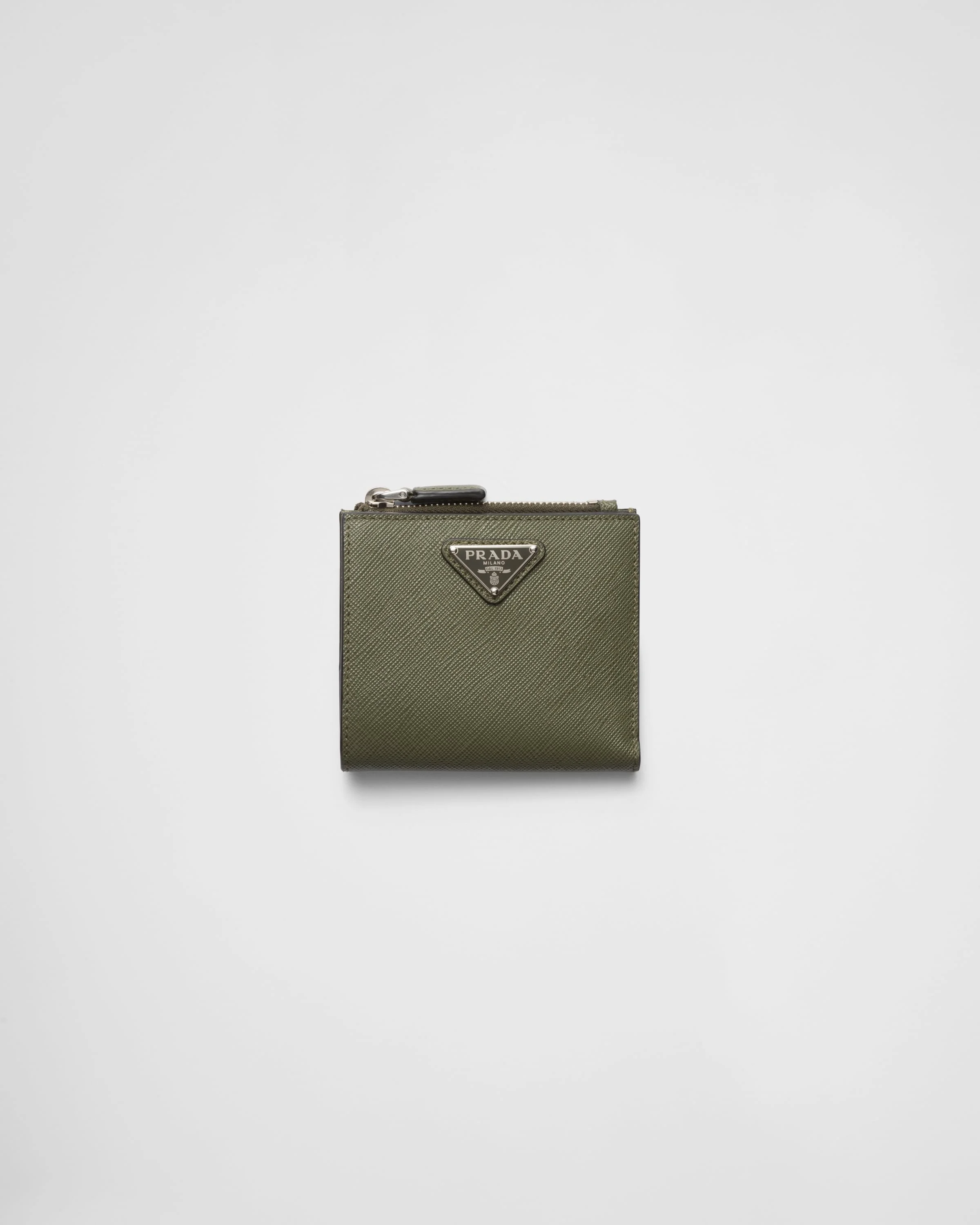 Sleek lines and the iconic texture of Saffiano leather characterize this wallet with the triangle logo on the front. The interior comes with pockets and compartments. - Product code: 2ML049_QHH_F0466 - Snap closure - Enameled metal triangle logo - Four card slots - One bill compartment - Two internal pockets - External coin pocket with zipper - Moire and Saffiano leather lining - Imported Height: 9cm Width: 10cm MATERIALS Main material: Calfskin