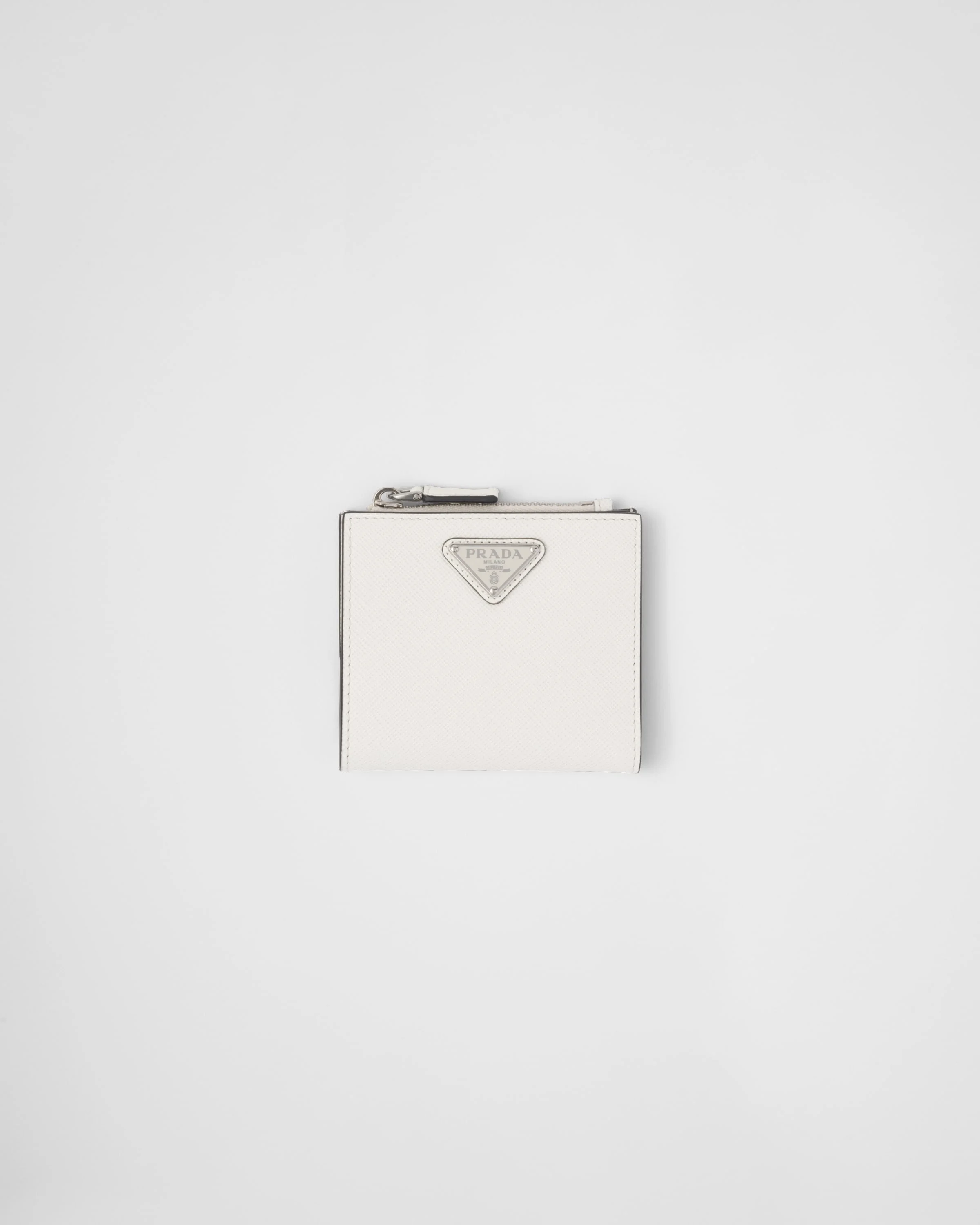 Sleek lines and the iconic texture of Saffiano leather characterize this wallet with the triangle logo on the front. The interior comes with pockets and compartments. - Product code: 2ML049_QHH_F0009 - Snap closure - Enameled metal triangle logo - Four card slots - One bill compartment - Two internal pockets - External coin pocket with zipper - Moire and Saffiano leather lining - Imported Height: 9cm Width: 10cm MATERIALS Main material: Calfskin
