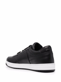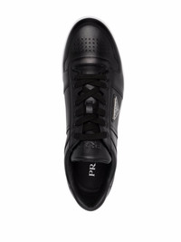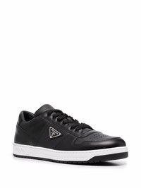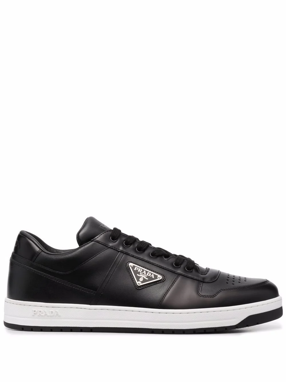 Downtown low-top sneakers Exhibiting Prada's penchant for merging sportswear silhouettes with luxury details, these leather sneakers feature a lace-up closure. The black colourway design is punctuated with the brand's enamel triangle logo to its side for a polished finish. Composition Outer: Calf Leather 100% Lining: Calf Leather 100%, Fabric 100% Sole: Rubber 100% SIZE & FIT Measurement HEEL 1.37 in(3.5 cm)