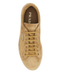 caramel brown front lace-up fastening flat rubber sole enamel triangle logo branded insole - Color: BROWN - Made in: Italy - Designer Style ID: 2EE413 F G001 054 F0379 Composition and care Lining Composition Calf Leather: 100.0%, Outer Composition Calf Suede: 100.0%, Sole Composition Rubber: 100.0%
