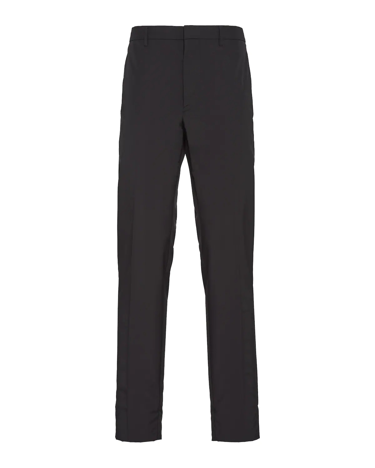 These technical wool trousers with a jogging fit have casual style. They have a drawstring waistband, welt pockets on the back, and a pouch in iconic Prada nylon for storing the garment. - Product code: SPG29_1VTK_F0002_S_182 - Jogging fit - Angled slash pockets on the front - Welt pockets on the back - Elasticized waistband with drawstring - Zipper fly with hook - Nylon pouch with logo to store the garment - 54% virgin wool, 45% polyamide - Height: 102cm MATERIALS Wool