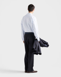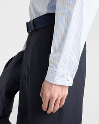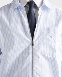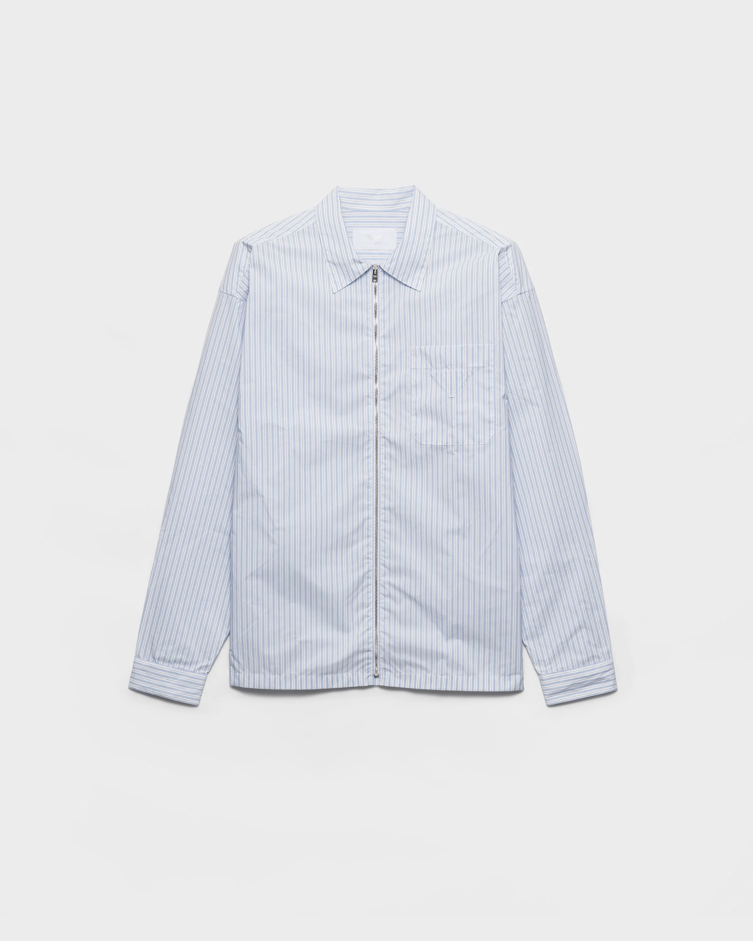 The duality that characterizes Prada collections is reflected in the creation of hybrid designs that blend different materials and styles to create something innovative. The shirt with classic collar and loose fit, a menswear wardrobe staple, is reinvented with a zipper closure that adds a contemporary accent. The iconic triangle logo in the form of a fabric patch decorates the style. For sustainable care to preserve the product's characteristics and reduce microfiber shedding, we recommend not washing the item too often. Let the product air out after every use and follow the washing instructions on the label. - Product code: SC855_189H_F0W81_S_OOO - Loose fit - Classic collar - Patch pocket - Straight hem - Cuff with mother-of-pearl button - Zipper closure - Fabric triangle logo on the front - Imported - The model is 188 cm tall and wears a size 48 Height: 72cm MATERIALS Main material: 100% Recycled Polyamide