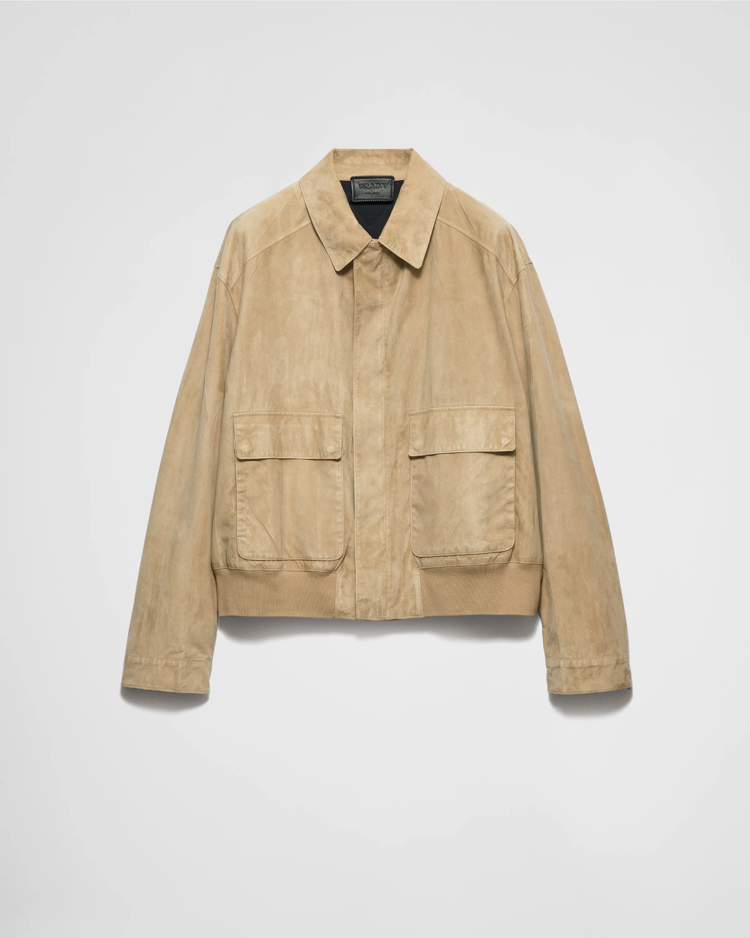 Bonded suede and cotton fabrics are chosen for this hybrid design with sophisticated allure. - Product code: UPW541_16EC_F038K_S_OOO - Unlined garment - Regular fit - Concealed zipper and button closure - Shirt-style collar - Straight sleeve and shirt-style cuffs - Patch pockets - Ribbed knit hem - Leather triangle logo on the back - Pressed finished garment - Imported - The model is 189 cm tall and wears a size 48 Height: 65cm MATERIALS Main material: Lambskin