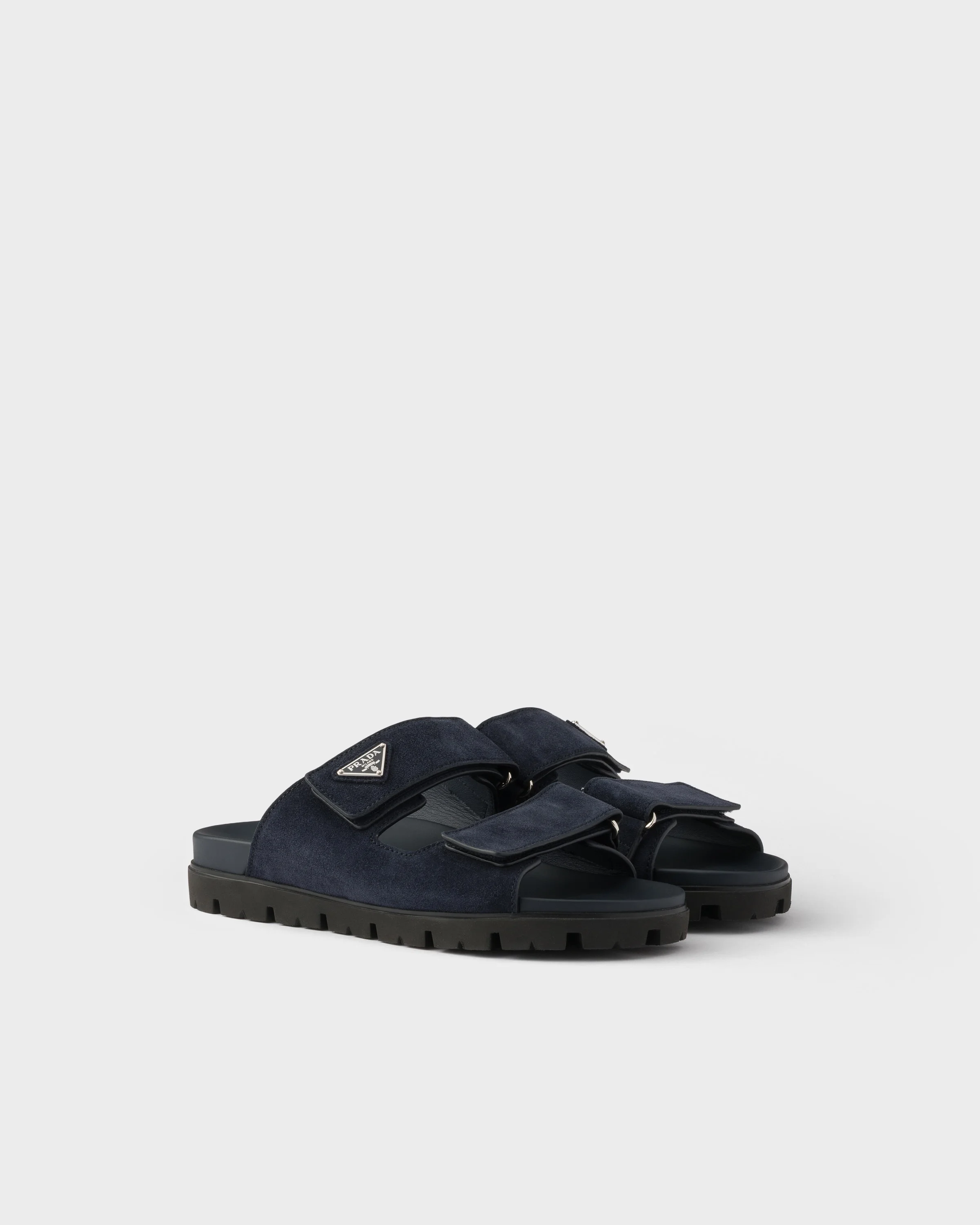 Sporty functionality and sophisticated details coexist in the design of these soft suede sandals. The contemporary and versatile footwear is decorated with the enameled metal triangle logo. - Product code: 2X3129_054_F0008_F_G000 - Hook-and-loop straps - Enameled metal triangle logo - Rubber sole with tire-patterned tread - Heel height: 25 mm - Leather-covered insole - Imported MATERIALS Main material: Calfskin