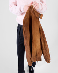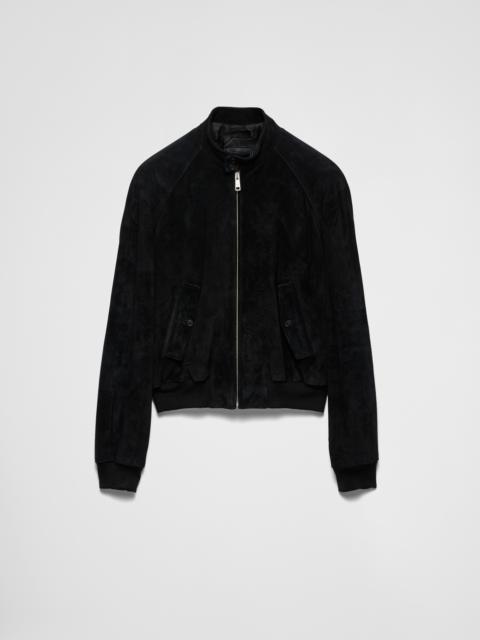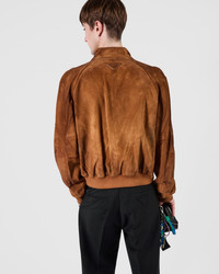 This suede bomber jacket is reimagined with a vintage twist, its classic silhouette redefined by a subtle treatment that adds depth and character to the supple suede. The central zip fastening and stand-up collar create a streamlined look, while the raglan sleeve and knitted cuffs provide a comfortable fit. - Product code: UPW524_158G_F098L_S_OOO - Lined - Regular fit - Central zip fastening - Stand-up collar - Raglan sleeve and knitted cuffs - Flap pockets - Hem with knitted edge - Leather triangle logo at centre back - Vintage treatment - Imported - The model is 188 cm tall and wears a size 48 Height: 62cm MATERIALS Main material: Calfskin