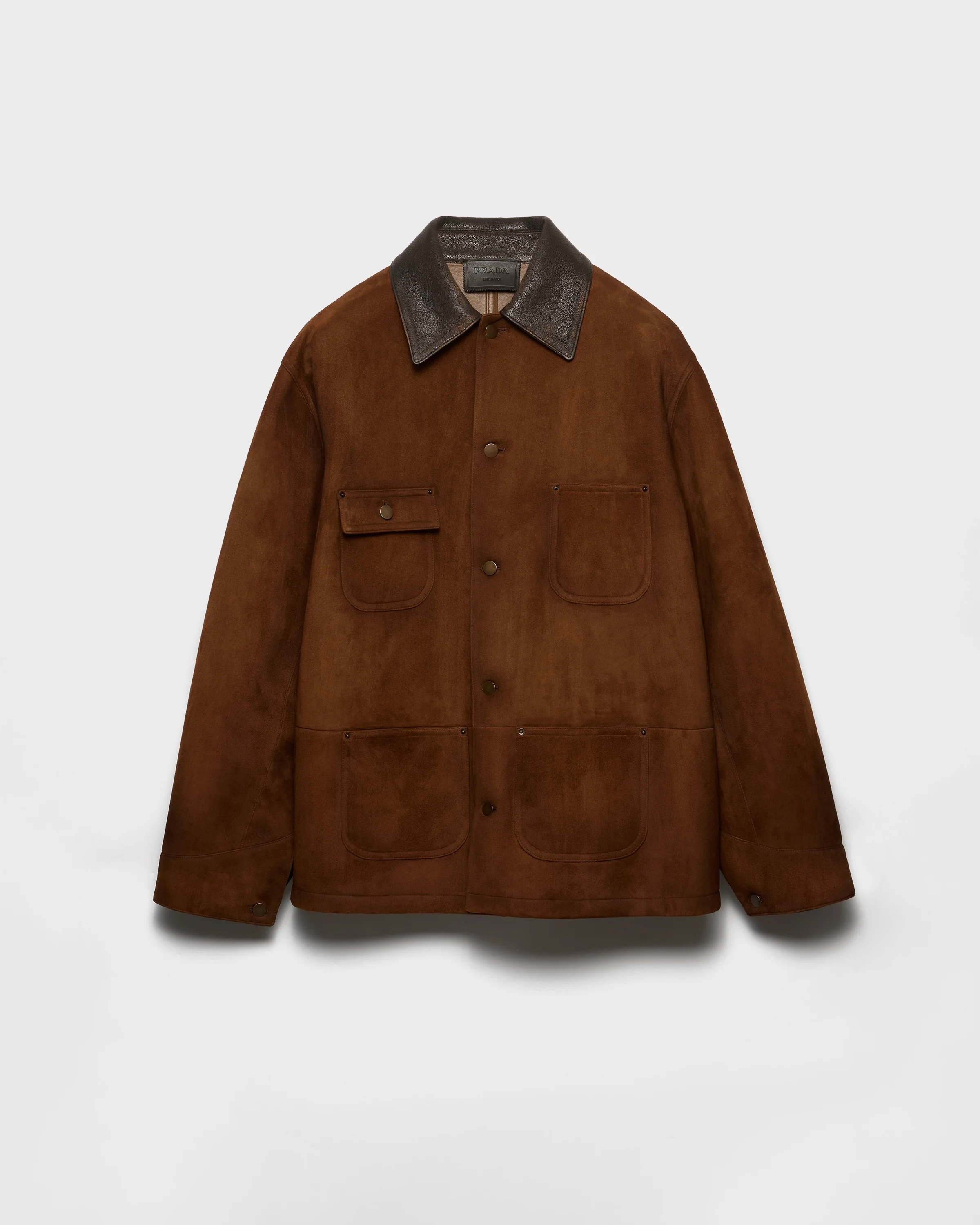 A key silhouette in the Prada wardrobe, this caban jacket with a utility style is reinterpreted in soft suede. The velvety texture has a vintage finish created with special artisan treatments that give it a natural aged look. The oversized, structured design is completed with a leather collar in a contrasting shade. - Product code: UPS694_173B_F0324_S_OOO - Unlined - Regular fit - Center button closure - Shirt-style collar - Straight sleeves with shirt-style cuff - Patch pockets - Leather triangle logo on the back - Vintage treatment - Imported - The model is 188 cm tall and wears a size 48 Height: 78cm MATERIALS Main material: Lambskin