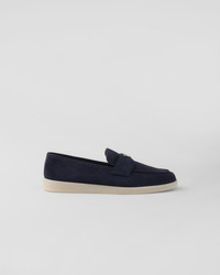These soft suede loafers with a leather lining have a modern silhouette. The enameled metal triangle logo stands out on the front. - Product code: 2DG124_103_F0008 - Band with enameled triangle logo - Apron with pinched stitch seam - Light rubber sole - Heel height: 15 mm - Removable leather-covered insole - Imported MATERIALS Main material: Calfskin