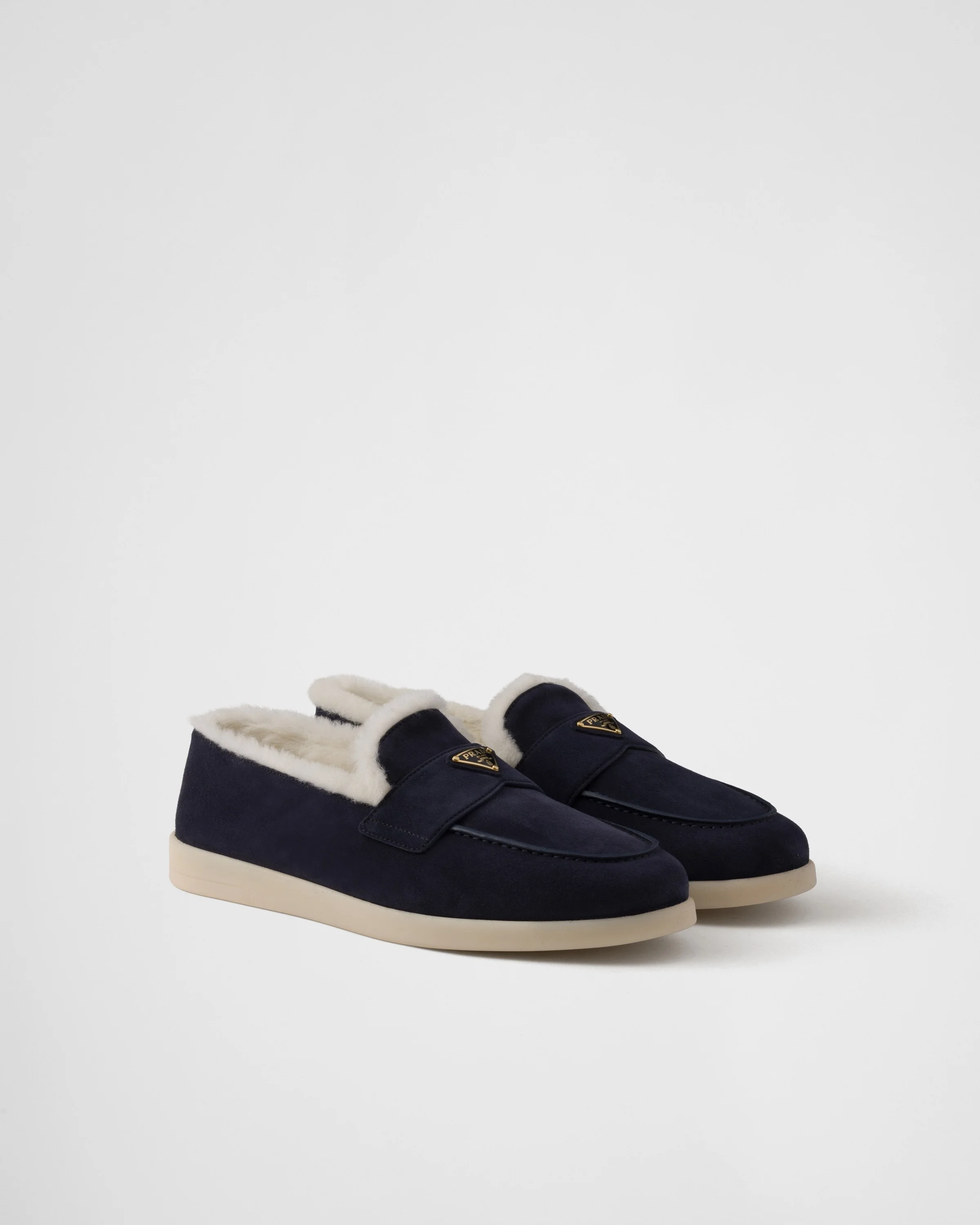 These suede loafers with clean lines and a modern silhouette have a soft shearling lining and are decorated with the distinctive triangle logo. - Product code: 2DG124_AAX_F0008_F_A001 - Shearling lining - Lightweight rubber sole - Heel height: 15 mm - Removable shearling insole - Imported MATERIALS Main material: Calfskin
