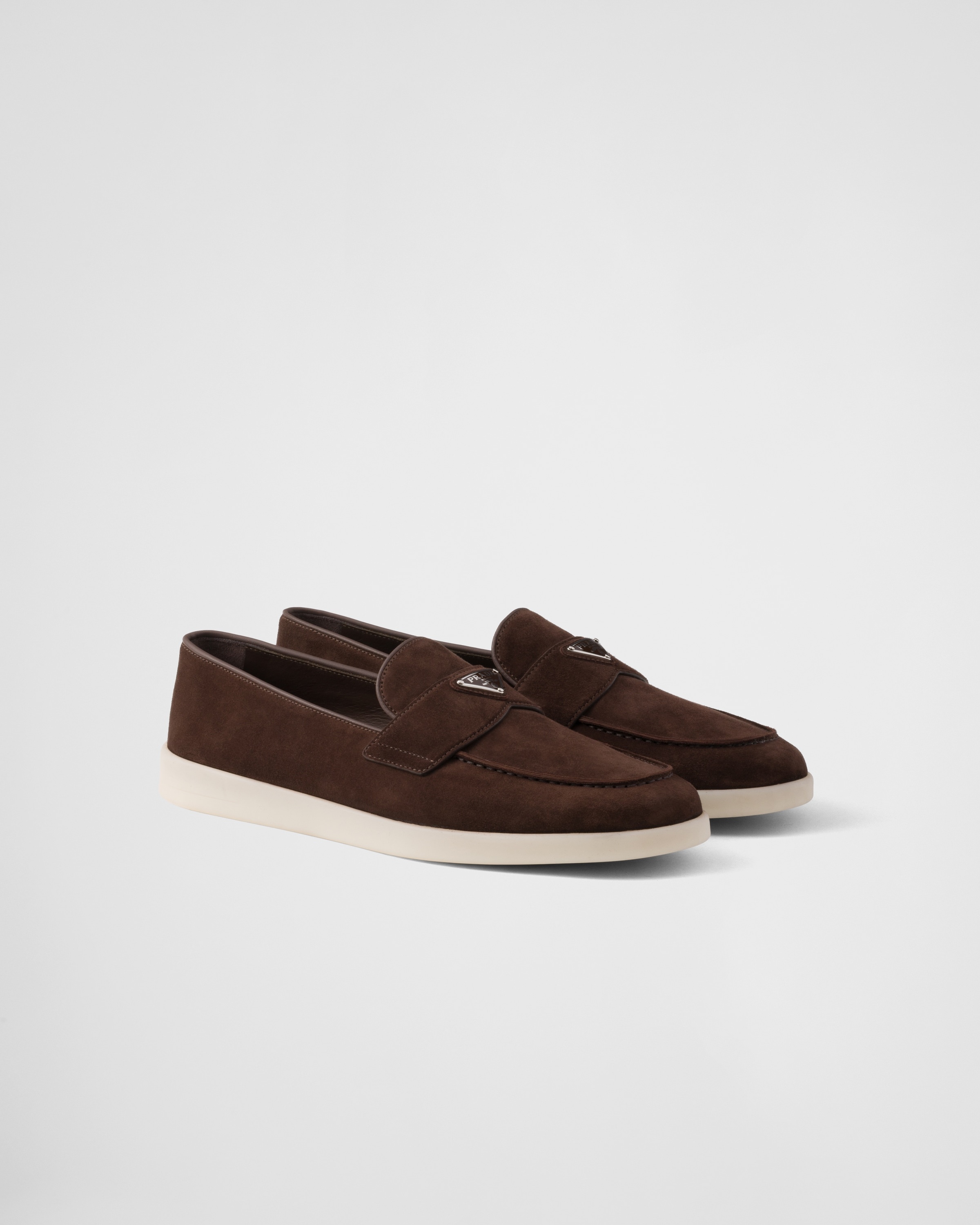 These soft suede loafers with a leather lining have a modern silhouette. The enameled metal triangle logo stands out on the front. - Product code: 2DG124_103_F0003_F_G001 - Band with enameled triangle logo - Apron with pinched stitch seam - Light rubber sole - Heel height: 15 mm - Removable leather-covered insole - Imported MATERIALS Leather
