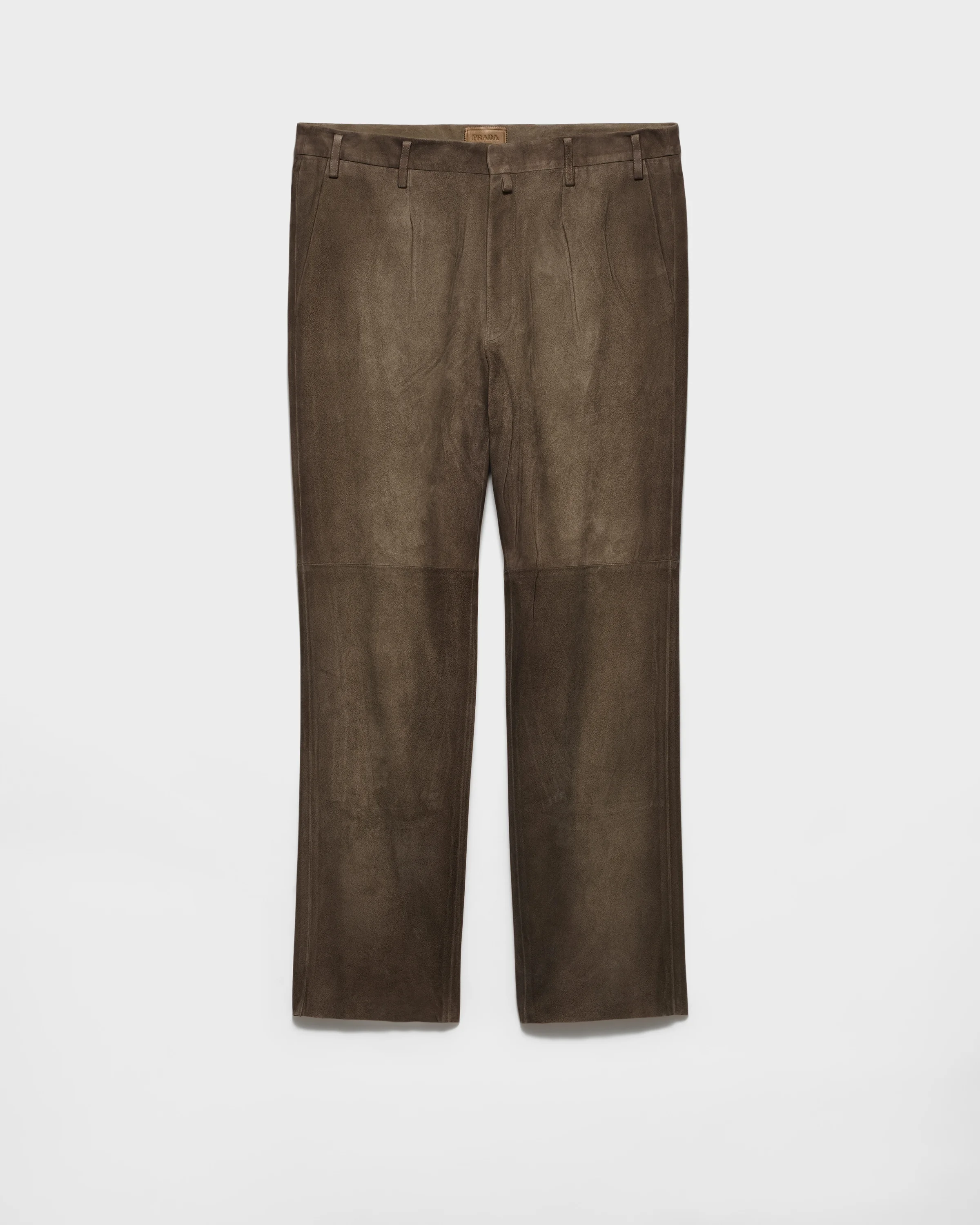 New interactions between structure and lightness define these suede pants, characterized by a paper- bag waist enhances with a narrow belt The garment embodies a refined style and casual, contemporary elegance. - Product code: UPP295_18OM_F0170_S_OOO - Lined garment - Regular fit - Zipper fly with button - Angled front slash pockets - Back welt pocket with button - Vintage treatment - Leather belt - Pressed finished garment - Imported - The model is 191 cm tall and wears a size 48 Height: 102cm MATERIALS Main material: Lambskin