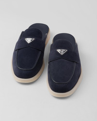 These mules made of soft suede have a versatile, refined silhouette. The enameled metal triangle logo embellishes the upper, while the rubber sole adds a casual note to the design. - Product code: 2DG125_103_F0008_F_G001 - Leather lining - Upper with band and enameled metal triangle logo - Light rubber sole, 15 mm - Leather-covered insole - Imported MATERIALS Main material: Calfskin