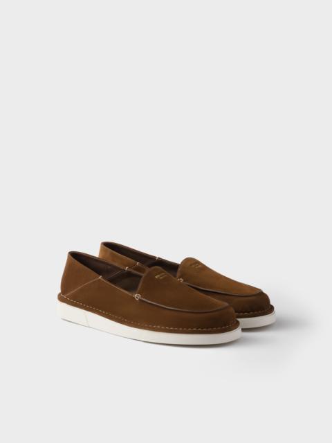 These suede slip-ons have a sleek, tapered silhouette with a casual attitude. The versatile, lightweight footwear features soles in a contrasting color, while the Prada Milano logo completes the shoe with a distinctive, refined touch. - Product code: 2DF088_103_F0324_F_G000 - Upper with stitched apron - Prada Milano logo on the upper - Lightweight expanded rubber sole with triangle-patterned tread, 25 mm - Leather-covered insole - Imported MATERIALS Main material: Calfskin