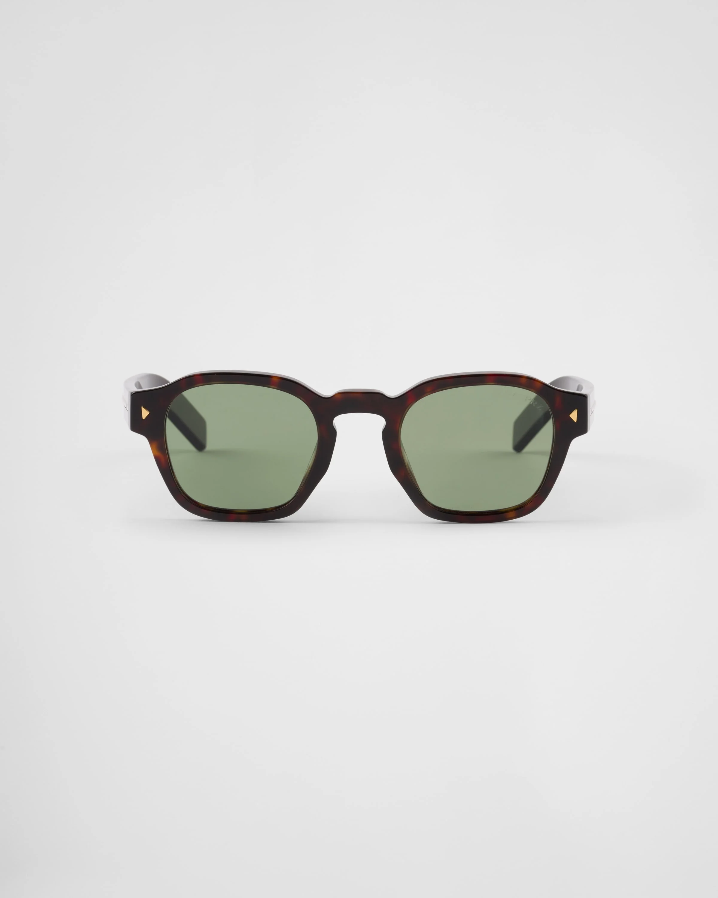Acetate sunglasses with informal elegance. The pantos front is characterized by refined triangular rivets, while the temples are embellished with the iconic metal plaque decorated with the Prada lettering logo. - Product code: SPRA16_F17N_FE20G_C_049 - Recycled bio-acetate frame front -- Color: Briarwood Tortoiseshell - Frame compatible with graduated lenses - 100% UVA / UVB protection - Polarized Crystal Lenses - Standard Fit - Lens-nose-temple measurement: 49-24-145 mm - Article comes with dedicated packaging - Other colors available - Imported MATERIALS Acetate