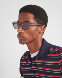 Acetate sunglasses with informal elegance. The pantos front is characterized by refined triangular rivets, while the temples are embellished with the iconic metal plaque decorated with the Prada lettering logo. - Product code: SPRA16_E17T_FE05D_C_049 - Bio-acetate frame front - Color: Ocean Blue - Frame compatible with graduated lenses - 100% UVA / UVB protection - Crystal Lenses - Standard Fit - Lens-nose-temple measurement: 49-24-145 mm - Article comes with dedicated packaging - Other colors available - Imported MATERIALS Acetate
