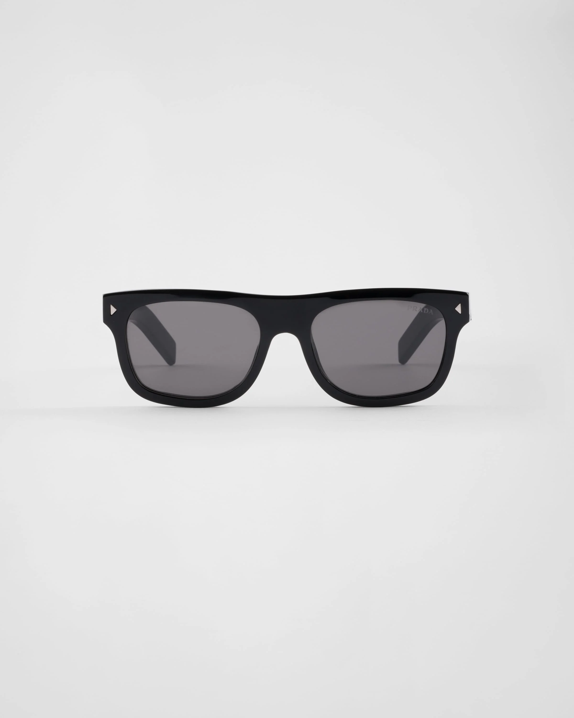 Acetate sunglasses with a contemporary, geometric design. The flat square front is defined by triangular metal rivets, while the temples are embellished with the iconic metal element decorated with the Prada lettering logo. - Product code: SPRB12_E16K_FE731_C_055 - Acetate frame front - Color: Black - -Frame compatible with graduated lenses - 100% UVA / UVB protection - Crystal lenses - Standard fit - Lens-nose-temple measurement: 55-19-145 mm - Article comes with dedicated packaging - Other colors available - Imported MATERIALS Acetate