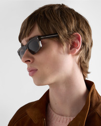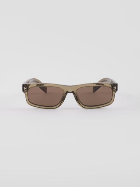 Acetate sunglasses with a sleek and refined aesthetic. The rectangular front features sophisticated triangular rivets, while the temples highlight the iconic metal element embellished with the Prada lettering logo. - Product code: SPRB11_E18T_FE70F_C_057 - Acetate frame front - Color: Transparent Brown - Frame compatible with graduated lenses - 100% UVA / UVB protection - Crystal Lenses - Standard fit - Lens-nose-temple measurement: 57-17-145 mm - Article comes with dedicated packaging - Other colors available - Imported MATERIALS Acetate