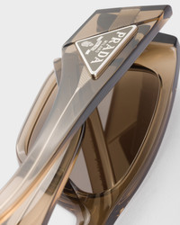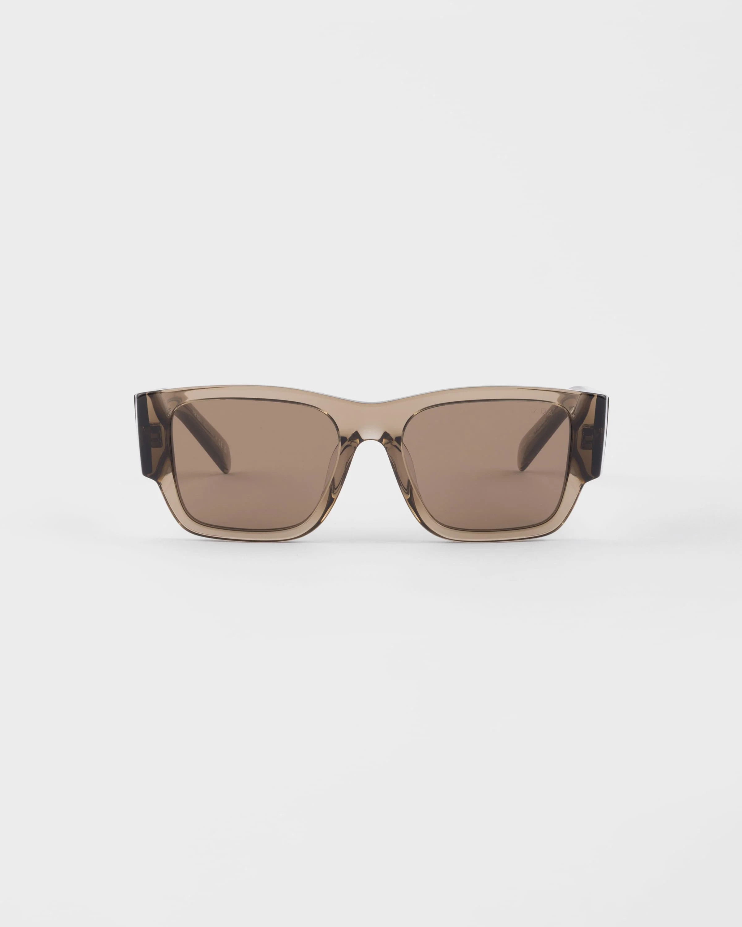 Acetate sunglasses with a bold, geometric aesthetic. The frame has a strong, square design emphasized by thick rims. The oversized two-tone temples are decorated with an exclusive metal plaque depicting the iconic Prada triangle logo. - Product code: SPR10Z_E22H_FE90F_C_054 - Recycled bio-acetate frame front - Color: Transparent Bark Brown - Frame compatible with graduated lenses - 100% UVA / UVB protection - Standard Fit - Lens-nose-temple measurement: 54-20-140 mm - Article comes with dedicated packaging - Other colors available - Imported MATERIALS Main material: Acetate