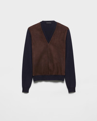 Prada's dualism is expressed in new shapes and material mixes as in this sweater made of wool and suede. - Product code: UMF120_17W0_F0008_S_OOO - Plain knit - Slim fit - Ribbed knit V-neck - Raglan shoulder - Ribbed knit cuffs and hem - Triangle logo - Suede insert - Imported - The model is 189 cm tall and wears a size 48 Height: 65cm MATERIALS Main material: 100% virgin wool