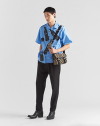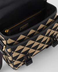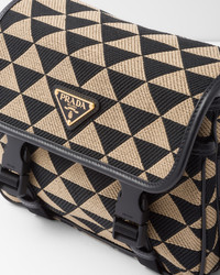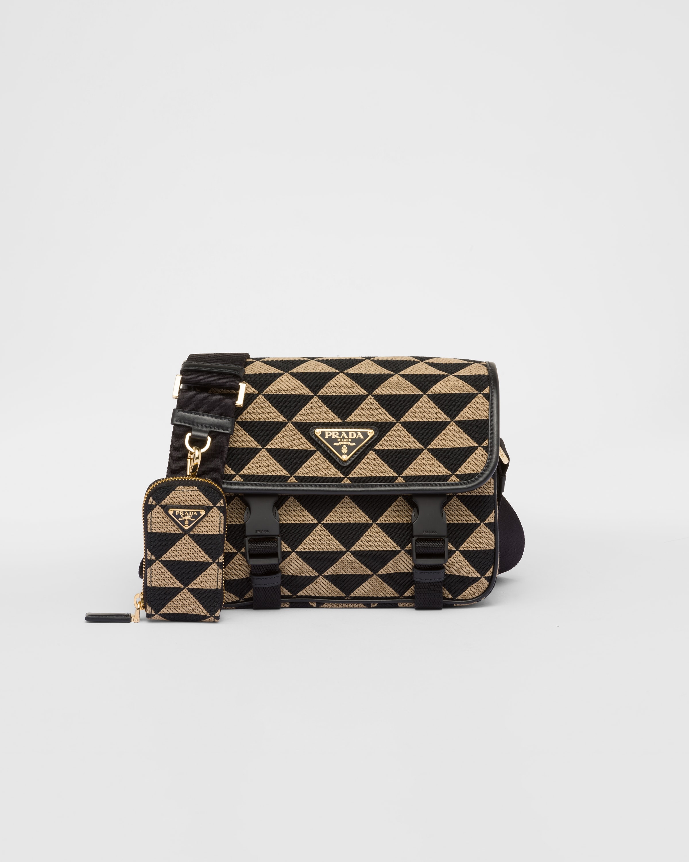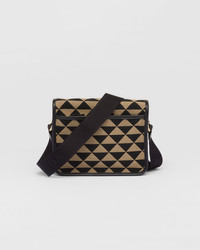 First introduced on trunks designed by Mario Prada, the triangle expresses uniqueness and modernity through its universal, minimalist shape reinvented in a different way each season. Here, the geometric design is transformed into a sophisticated yet modernist pattern that plays with contrasting colors. The accessory is very versatile and can be carried by hand or worn over the shoulder. - Product code: 2VD034_2FKL_F0Y30_V_XOP - Adjustable and removable nylon and leather ribbon shoulder strap with removable pocket - Enameled metal triangle logo on the front - Flap closure and snap system - Back zipper pocket - Lined Re-Nylon initialed - Height: 16cm - Width: 22cm - Length: 7cm - Imported MATERIALS Fabric/leather