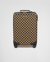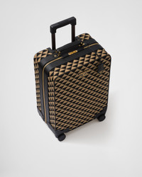 Introduced for the first time on trunks designed by Mario Prada, the Prada triangle expresses uniqueness and modernity through its universal, minimalist shape that is reinvented in a different way each season. Here, the geometric design is transformed into a sophisticated yet modernist pattern that plays with contrasting colors and decorates this sleek trolley. Details in the brand's iconic Saffiano leather embellish the design. - Product code: 2VQ004_2FKL_F0Y30_V_TOK - Leather handle - Enameled metal triangle logo on the front - Zipper closure with small lock - Removable leather name tag and keychain - Telescopic handle on the back - Interior with leather straps and buckle and with zipper pocket - Re-Nylon logo lining - Four wheels - Cabin size - Weight: 4.3 kg - Imported Height: 56cm Width: 37cm Length: 23cm MATERIALS Main material: Polyester