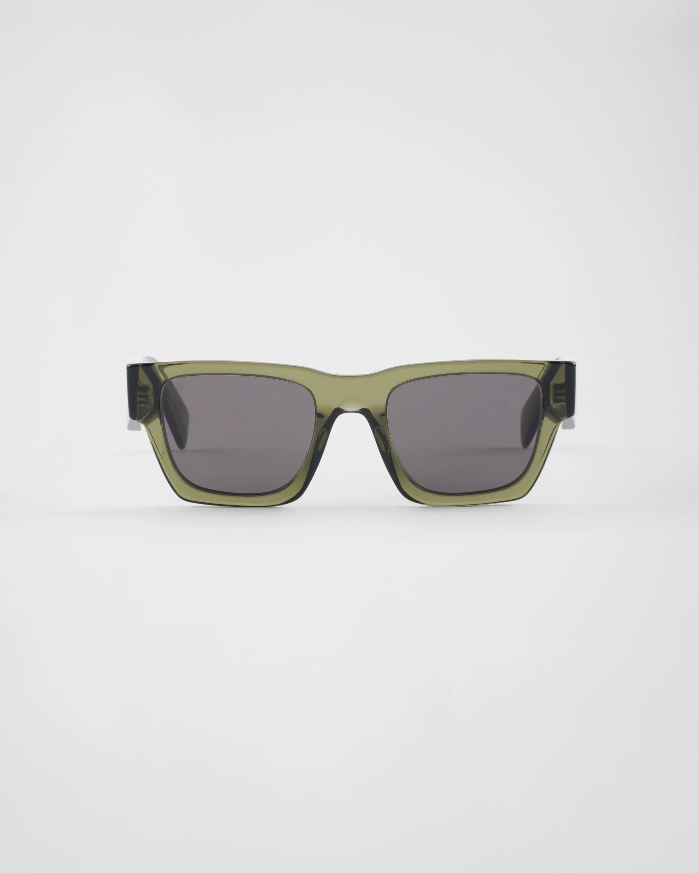 Acetate sunglasses with a contemporary rectangular design. The wide front with bold rims is paired with faceted temples enhanced by the distinctive three-dimensional workmanship decorated with the Prada lettering logo. - Product code: SPRA06_E25A_FE40L_C_050 - Acetate frame front - Color: Transparent military green - Frame not compatible with graduated lenses - 100% UVA / UVB protection - Standard fit - Lens-nose-temple measurements: 50-21-145 mm - Article comes with dedicated packaging - Other colors available - Imported MATERIALS Acetate