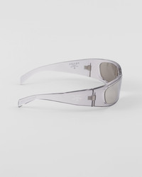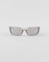 These new Prada Symbole sunglasses feature enveloping, contemporary lines. The three-dimensional crafting of the temples creates bold geometric shapes marked by an iconographic interpretation of the iconic Prada triangle logo. - Code du produit: SPRA19_E12R_F02B0_C_060 - Acetate frame front - Color: Transparent Gray - Frame not compatible with graduated lenses - 100% UVA / UVB protection - Standard fit - Lens-nose-temple measurements: 60-18-120 mm - Article comes with dedicated packaging - Other colors available - Importe MATERIALS Acetate