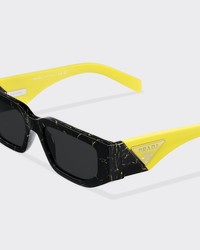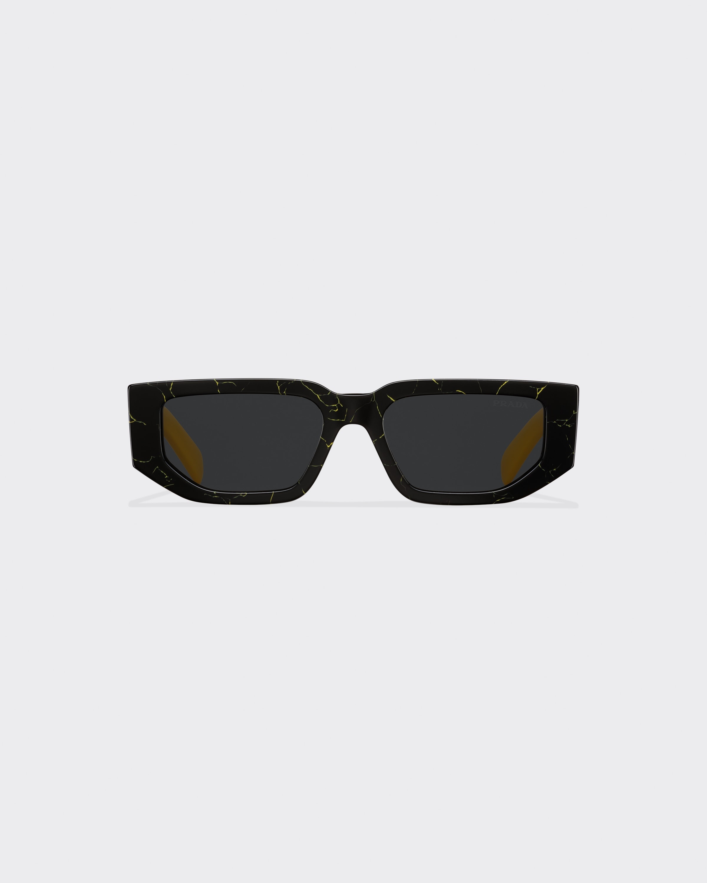 Rectangular acetate sunglasses with contemporary style. Angular rims define the frame and the chunky two-tone temples are decorated with an exclusive metal plaque that portrays Prada's iconic triangle logo. - Product code: SPR09Z_E19D_F05S0_C_054 - Acetate frame front in Marbleized Black and Yellow - Frame compatible with graduated lenses - 100% UVA / UVB protection - Standard fit - Lens-nose-temple measurement: 54-18-140 mm - Article comes with dedicated packaging - Imported - The model is 188 cm tall and wears a size 48