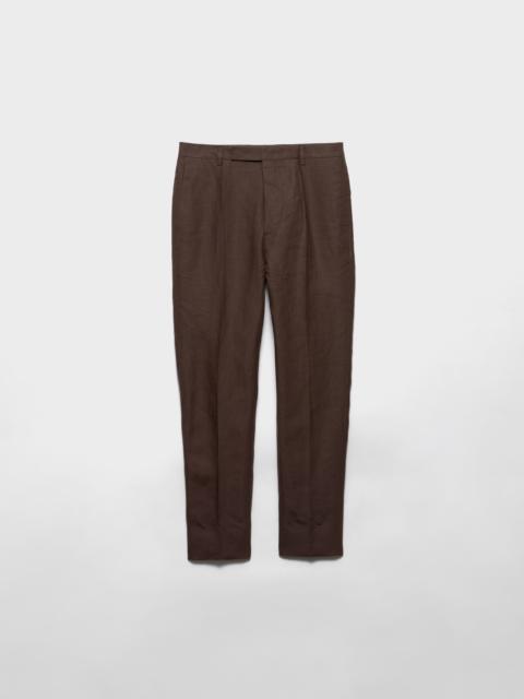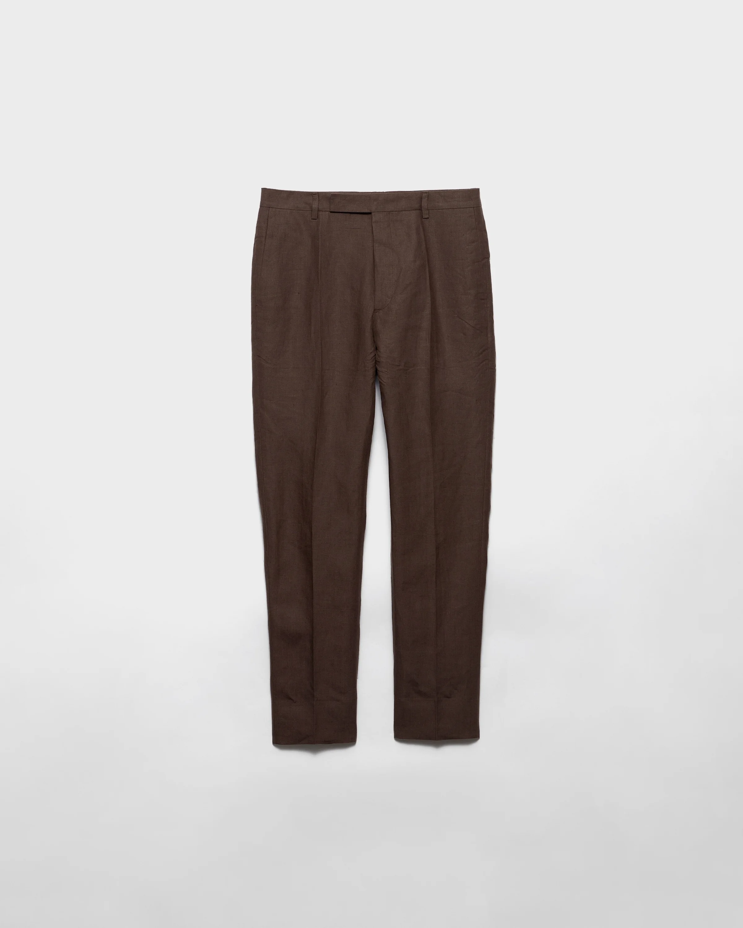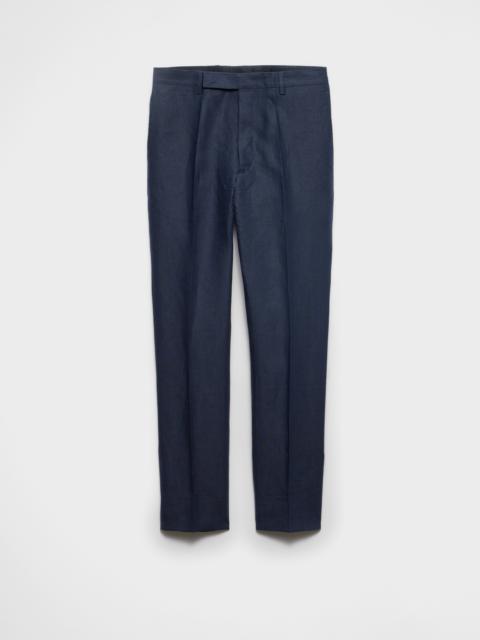 These light linen pants have a tailored cut and slim fit. The sleek geometric shape of the tonal triangle logo adds its signature touch to the refined style. - Product code: UP0141_15FS_F0192_S_WAO - Slim-fit silhouette - Concealed button fly with hook - Angled front slash pockets - Welt pockets with button on the back - Hem width: 18 cm - Sartorial label - Fabric triangle logo on the back - Imported - The model is 189 cm tall and wears a size 48 Height: 105cm MATERIALS Main material: 100% linen