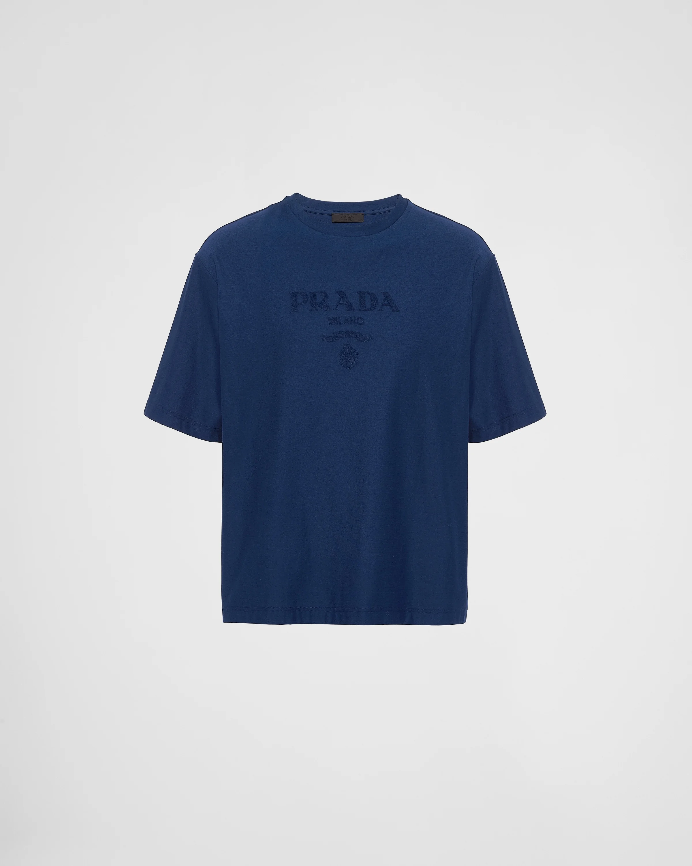The Prada cotton tee, a brand staple, embodies the luxury of simplicity that becomes an attitude and search to reinvent the basics and propose new meanings. The design is enriched by the brand's emblematic triangle logo. - Product code: UJN897_14LB_F0008_S_OOO - Oversized fit - Short ribbed knit sleeves - Straight hem - Embossed logo - Length: 70 cm, Size: M - Imported - The model is 189 cm tall and wears a size 48 Height: 70cm MATERIALS Main material: 73% cotton 27% polyamide