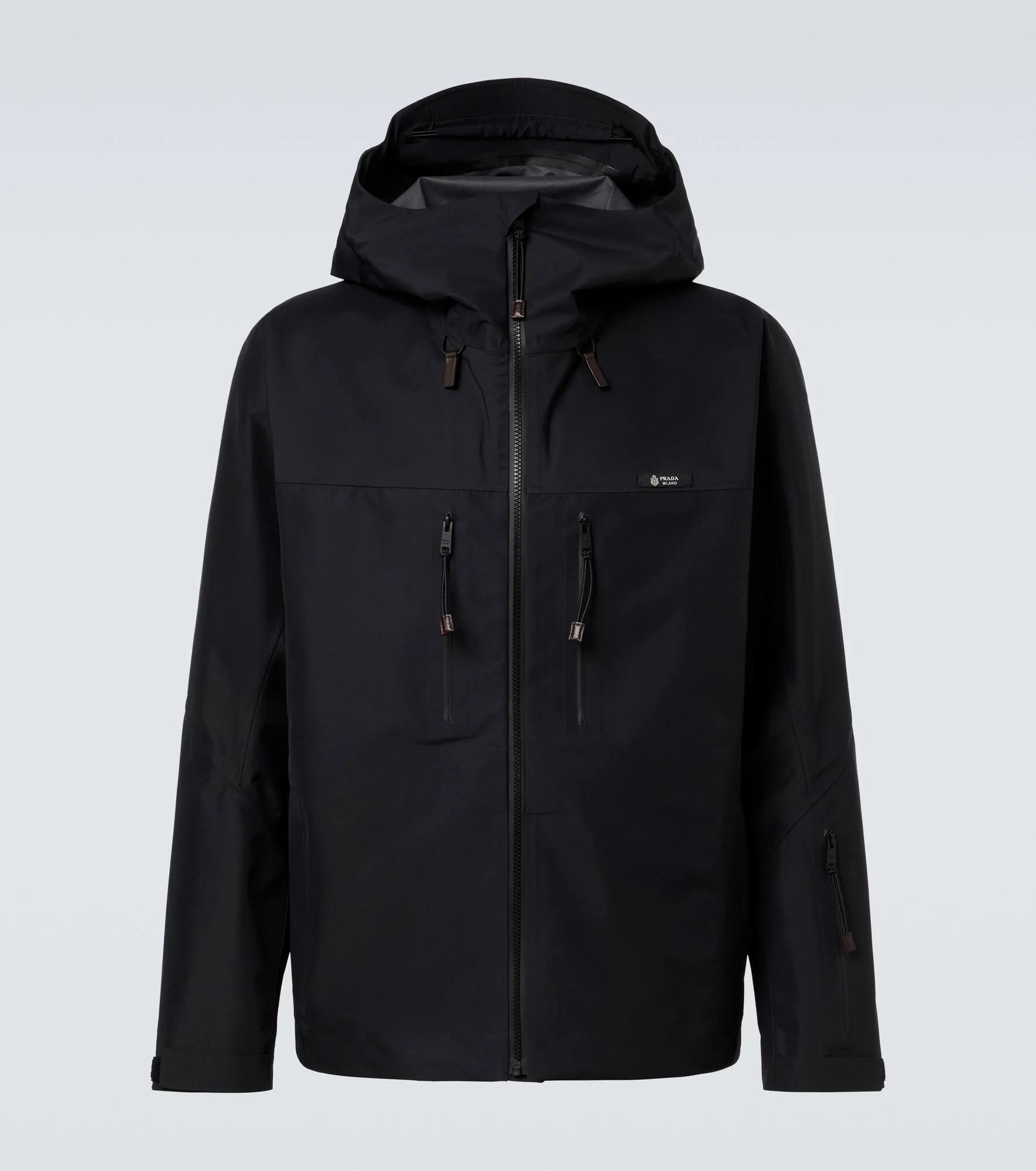 Prada embodies modern sophistication, blending timeless Italian craftsmanship with an innovative spirit. Made from lightweight technical fabric, this classic jacket comes with a large hood and zipped pockets. Product Details - Material: 100% polyester (recycled) - Care instructions: hand wash cold - Made in Italy - Color: black - Designer color name: Black - Item color: black - Details: 100% leather - Contains non-textile parts of animal origin - Hem: drawstring at the hem for an adjustable fit - Pockets: zipped pockets, sleeve pocket - Cuff: tab cuff - Drawstring hood - Item number: P01145468 Size & Fit - True to size - Straight fit - Adjustable hem - Non-stretchy fabric - Falls below the hip - The model in the picture is 185cm-6'1" and wearing a size L