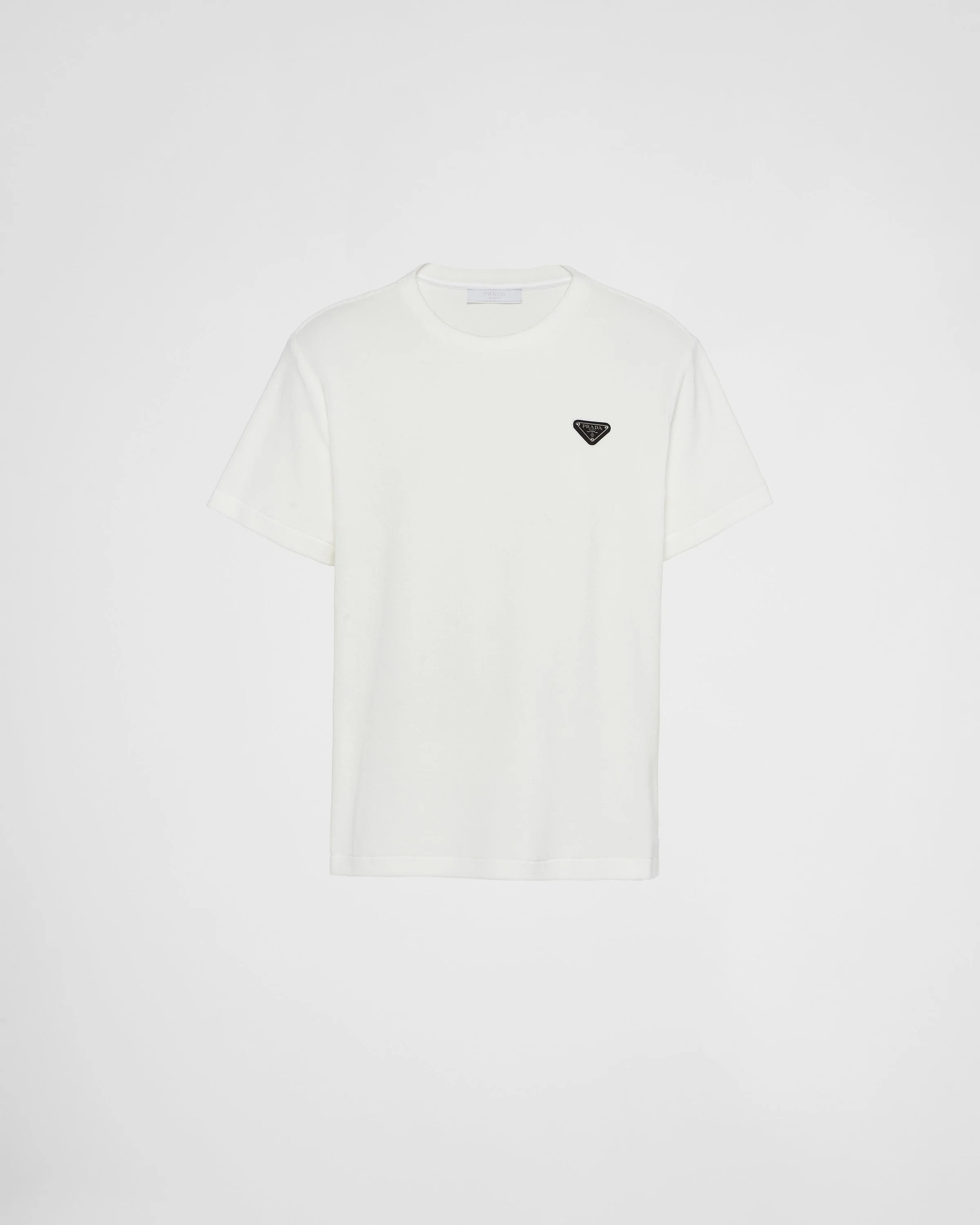 This tee with classic lines is made of terry cloth with a boxy cut for a relaxed fit. The emblematic enameled metal triangle logo completes the style with a distinctive note. - Product code: UJN885_122E_F0009_S_232 - Boxy fit - Short sleeves - Straight hem - Enameled metal triangle logo - Length 68 cm, size M - Imported - The model is 189 cm tall and wears a size 48 Height: 68cm MATERIALS Main material: 82% cotton 18% polyamide