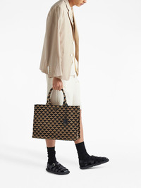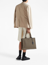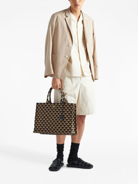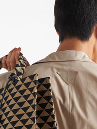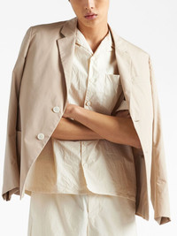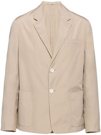 triangle logo cotton blazer This single-breasted blazer illustrates Prada's affinity for sartorial tailoring punctuated with modern details. Crafted in Italy from beige-hued cotton, its classical construction is detailed with the iconic triangle logo reimagined in a stripped-back, tonal fabric iteration. Composition Cotton 100%