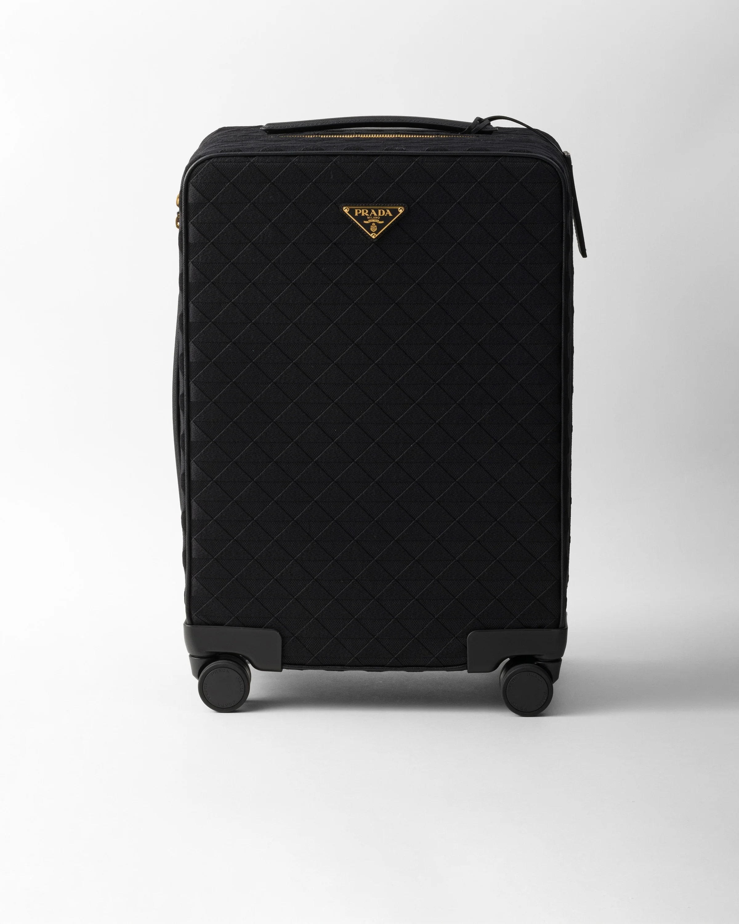 This elegant and pragmatic trolley is made of fabric with a tonal geometric pattern inspired by the iconic Symbole motif. The leather name tag completes the refined design enriched by the triangle logo. - Product code: 2VQ005_2F3D_F0002_V_OOO - Leather handle - Enameled metal triangle logo on the front - Zipper closure and TSA combination lock - Removable leather name tag - Telescopic handle on the back - Internal zipper compartment and compartment with elastic straps - Logo-print Re-Nylon lining - Four wheels - Capacity: 33.5 L - Cabin format - Imported Height: 56cm Width: 36cm Length: 22cm MATERIALS Main material: Calfskin