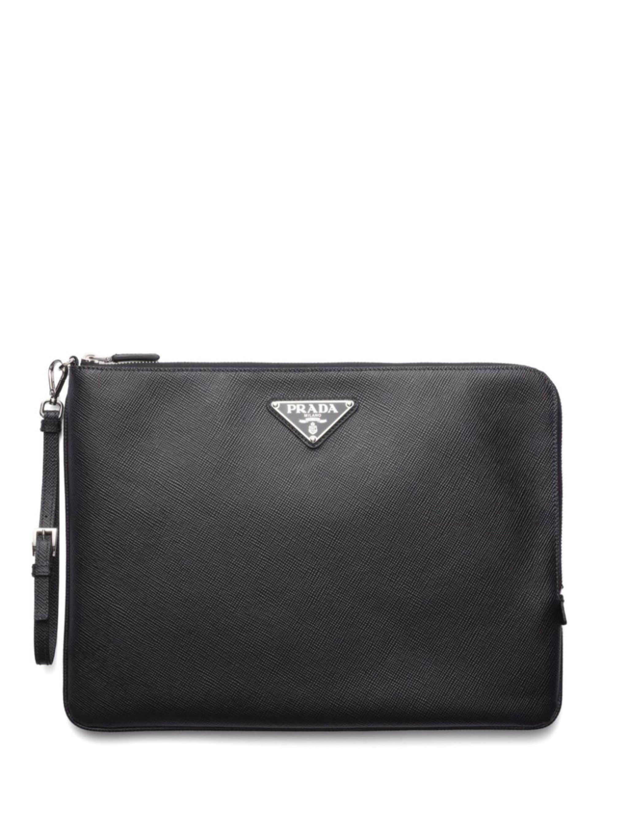 black Saffiano leather top zip fastening detachable wrist strap enamel triangle logo silver-tone hardware main compartment internal slip pocket Size & Fit Model Measurements: Bust: 0cm Height: 0cm Hips: 0cm Waist: 0cm Fabric and Care Designer Style ID: 2NH0232FAD Designer Colour: F0002 BLACK Composition: Outer: Leather 100%Made in Italy