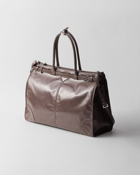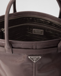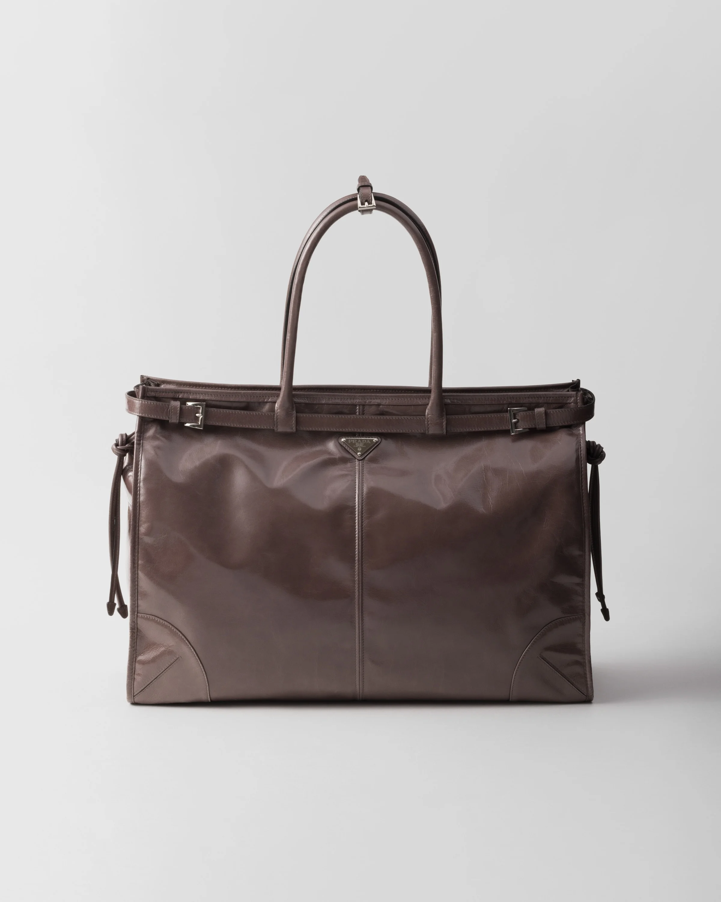 This pragmatic and refined tote is made of soft leather with a glossy finish that emphasizes the modern and versatile silhouette enhanced with refined straps. The roomy accessory blends different influences in a design with a sleek but distinctive aesthetic decorated with the iconic enameled metal triangle logo. - Product code: 2VG128_2CYR_F03SG_V_OOO - Decorative straps with buckles - Leather handles - Detachable, adjustable leather shoulder strap--Enameled metal triangle logo on the front - Zipper closure - Interior with zipper pocket - Logo-print Re-Nylon and nappa leather lining - Imported Height: 36cm Width: 50cm Length: 17cm MATERIALS Main material: Calfskin