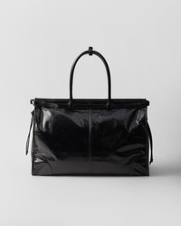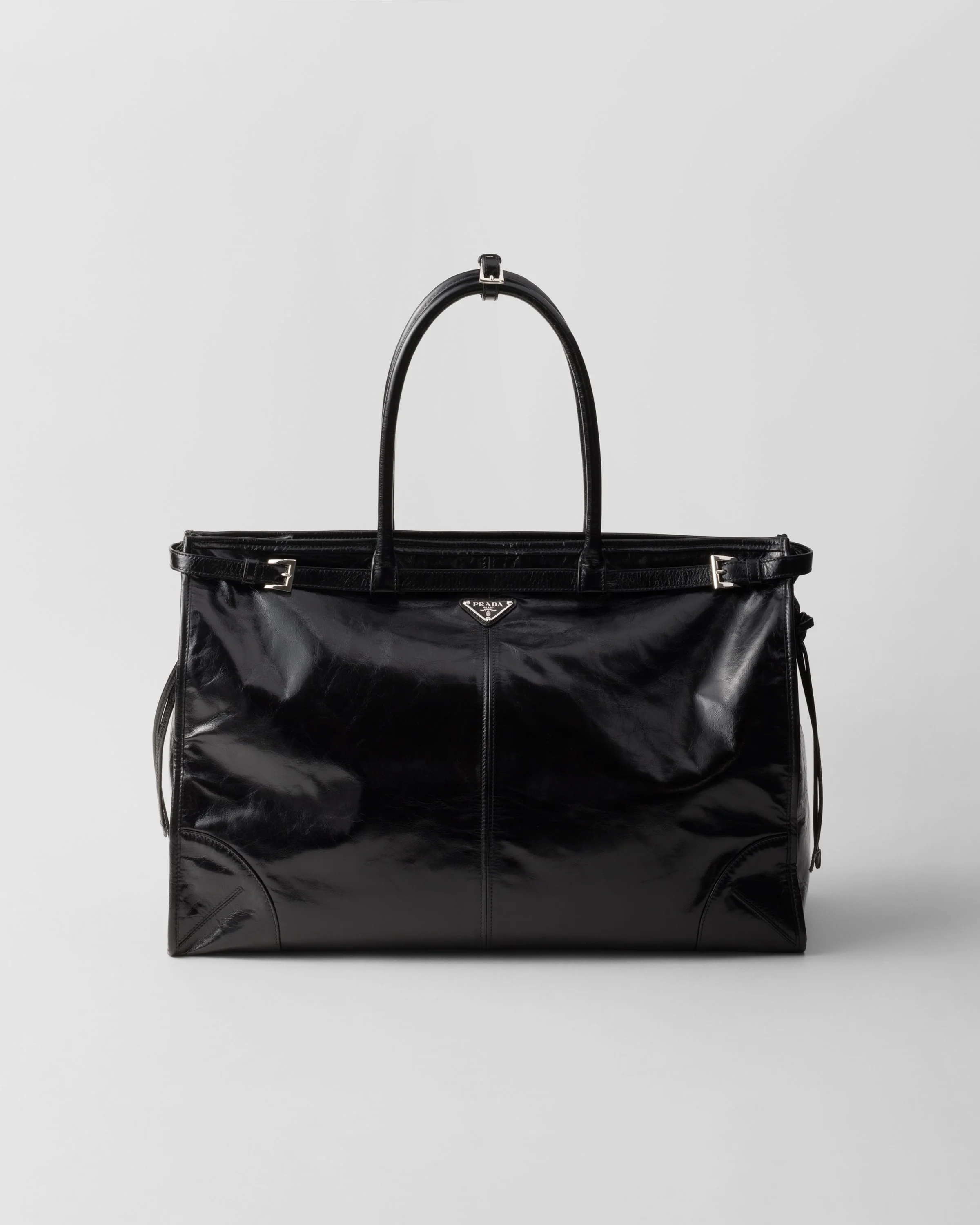 This pragmatic and refined tote is made of soft leather with a glossy finish that emphasizes the modern and versatile silhouette enhanced with refined straps. The roomy accessory blends different influences in a design with a sleek but distinctive aesthetic decorated with the iconic enameled metal triangle logo. - Product code: 2VG128_2CYR_F0002_V_OOO - Decorative straps with buckles - Leather handles - Detachable, adjustable leather shoulder strap--Enameled metal triangle logo on the front - Zipper closure - Interior with zipper pocket - Logo-print Re-Nylon and nappa leather lining - Imported Height: 36cm Width: 50cm Length: 17cm MATERIALS Main material: Calfskin