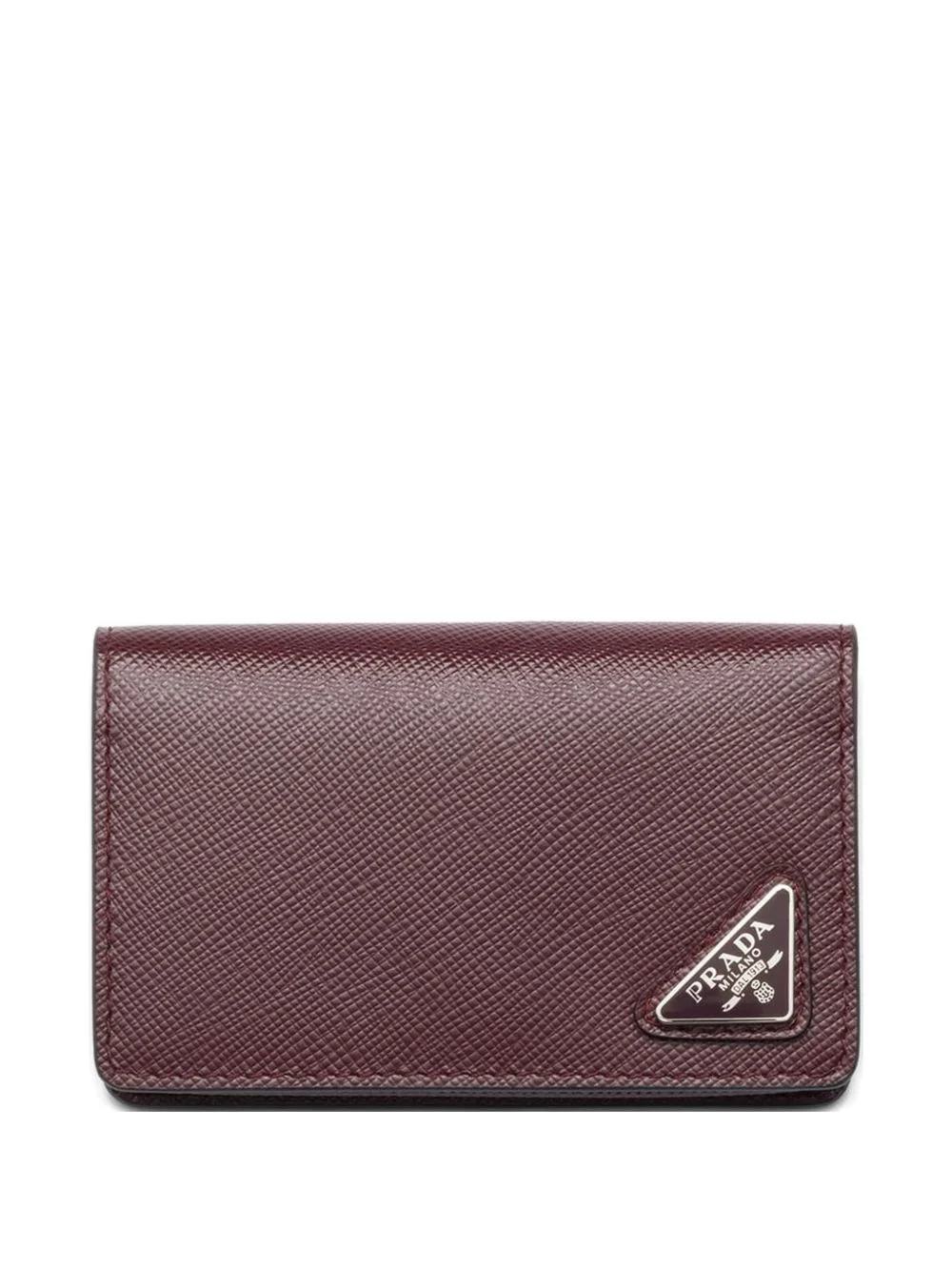 triangle-logo leather wallet Highlights - Red - Triangle logo - Two card slots - External pocket - Leather Composition Outer: Saffiano Leather 100% SIZE & FIT Measurement LENGTH 4.13 in(10.5 cm) WIDTH 2.75 in(7 cm)