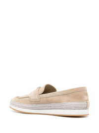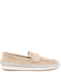 triangle-logo suede loafers Highlights - Beige - Calf suede - Enamel triangle logo - Braided edge - Almond toe - Branded leather insole - Flat rubber sole - Slip-on style Composition Outer: Calf Suede 100% Sole: Rubber 100% Lining: Calf Leather 100% SIZE & FIT Measurement HEEL 0.78 in(2 cm) Sole height 0.47 in(1.2 cm)