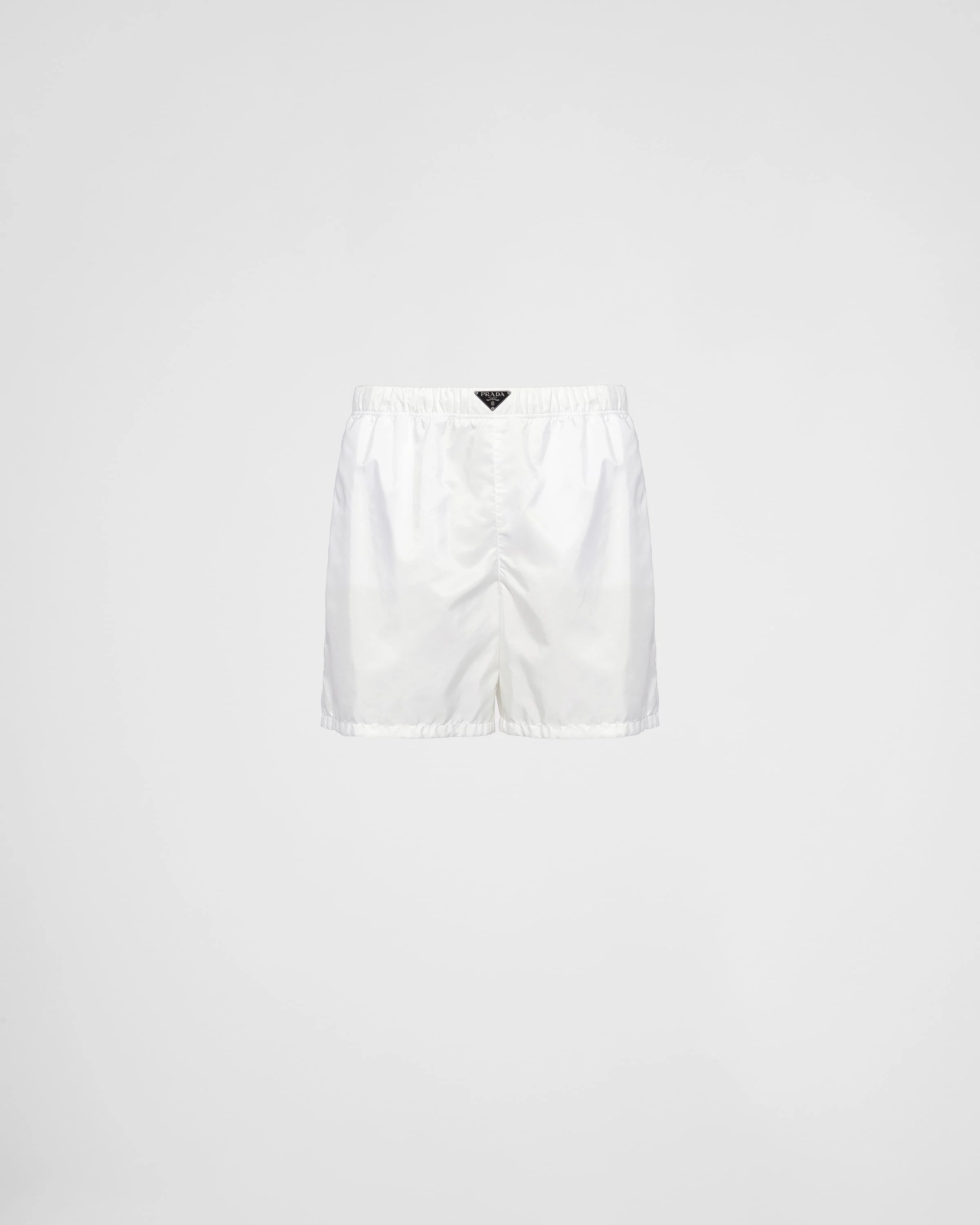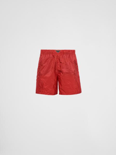 These swim trunks with a sleek, sporty design are made of Re-Nylon, the innovative regenerated nylon fabric that is distinctive of Prada collections and obtained from recycled plastic materials collected in the ocean. The style with a classic silhouette, characterized by the elasticized waistband, is decorated with the iconic enameled metal triangle logo. For sustainable care to preserve the product's characteristics and reduce microfiber shedding, we recommend not washing the item too often. Let the product air out after every use and have it dry cleaned at a specialized ecological dry cleaners. - Product code: UB372_1WQ9_F0009_S_OOO - Elasticized drawstring waistband - Enameled metal triangle logo - Mesh lining - Angled front slash pockets and back welt pocket - Re-Nylon pouch with fabric triangle - The fabric is made from regenerated yarn obtained from recycled plastic materials collected in the ocean. - Imported - The model is 189 cm tall and wears a size 48 Height: 41cm MATERIALS Main material: 100% recycled polyamide