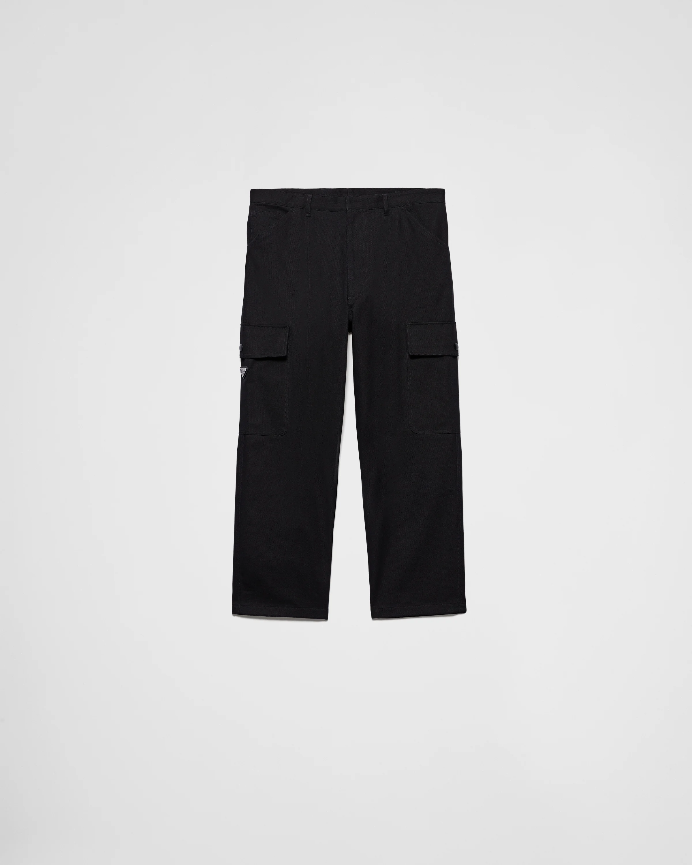 Utility pockets give a functional character to these cotton wide-leg pants with a classic cut. The enameled metal triangle logo completes the garment with a distinctive note. - Product code: SPH471_11BZ_F0002_S_OOO - Wide-leg fit - Hidden zipper fly with hook - Angled front slash pockets and small patch pocket - Back patch pockets - Hem width: 22 cm - Enameled metal triangle logo on the side pocket - Patch pockets on the side - Imported - The model is 188 cm tall and wears a size 48 Height: 100cm MATERIALS Main material: 100% cotton
