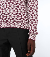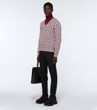 Knit from a soft wool, cashmere and technical blend, this burgundy and white sweater from Prada is made in Italy with a classic V-neckline. It features an all-over geometric jacquard pattern and is finished with ribbed trims. Product Details - Material: 69% wool, 29% cashmere, 2% polyamide - Care instructions: dry clean - Made in Italy - Designer color name: Bordeaux+Bianco - Item number: P00581320 Size & Fit - True to size - Designed for a loose fit - Falls to the hip - The model in the picture is 185cm-6'1" and wearing a size IT 48